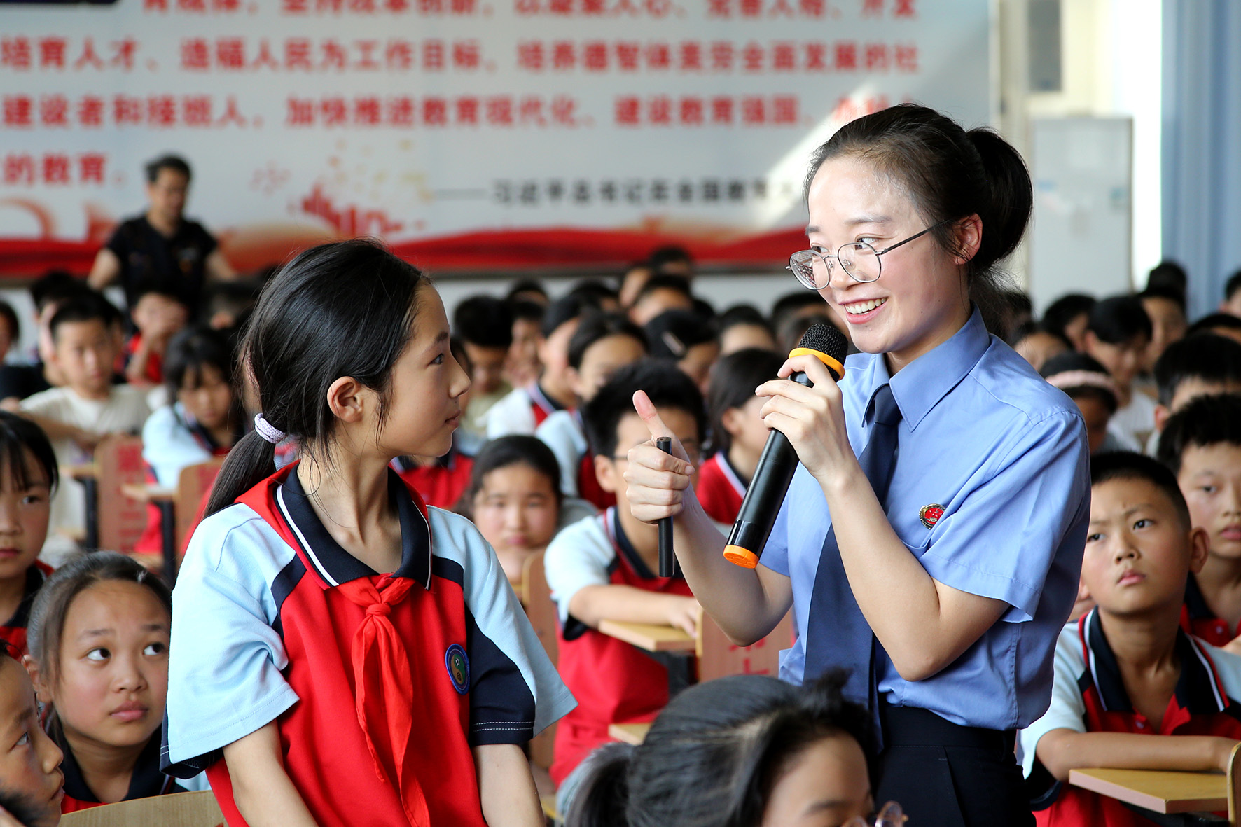 圖為檢察官在授課中與學(xué)生交流互動。