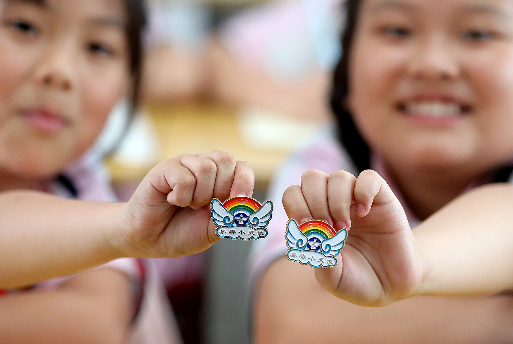 6月18日,湖北省沙洋縣公安局民警在洪嶺小學(xué),為30名同學(xué)佩戴“禁毒小天使”徽章,并帶領(lǐng)“禁毒小天使”在校園,向同學(xué)們宣傳禁毒知識,傳遞正能量。