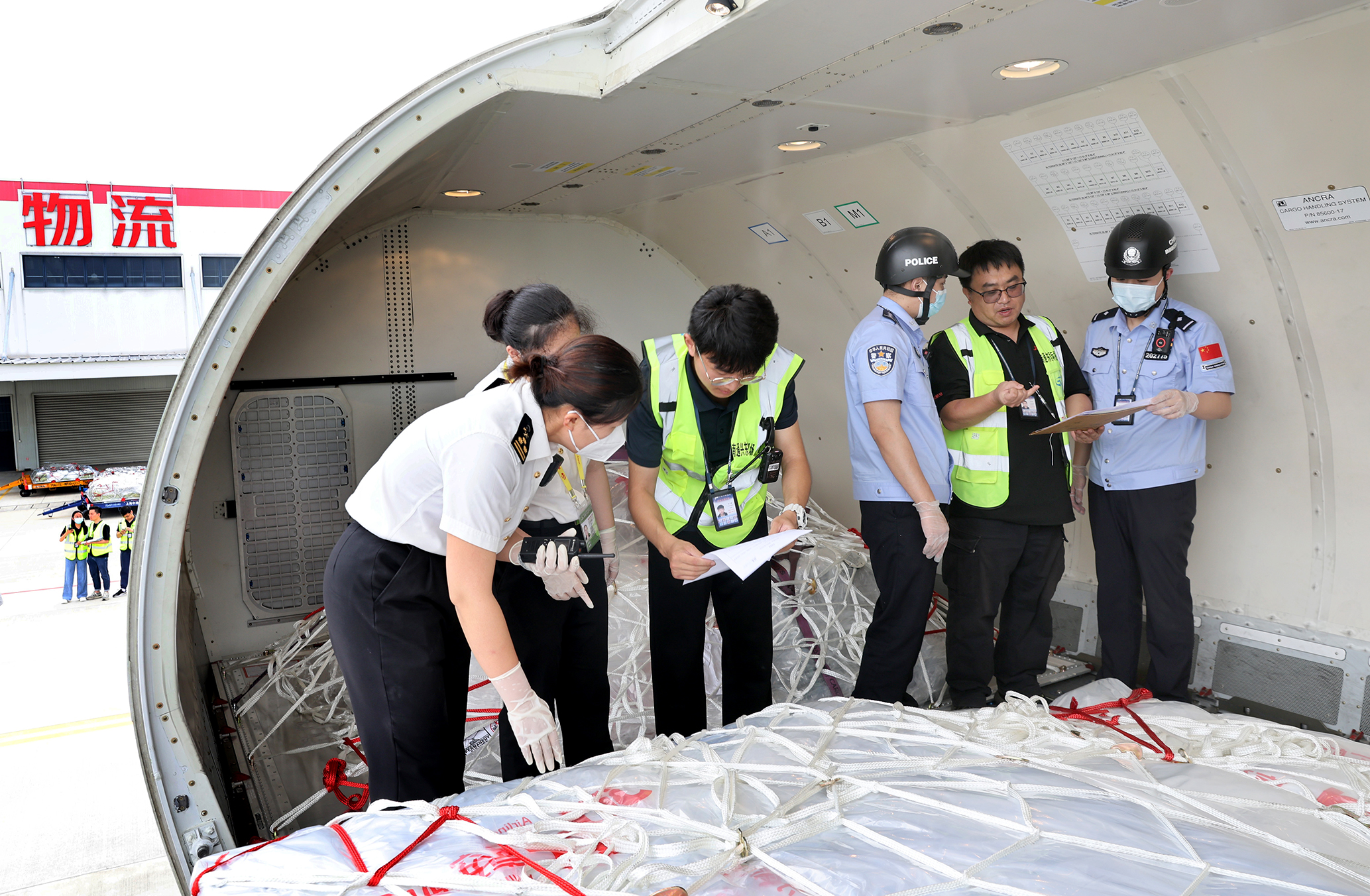 6月27日,南通海關(guān)關(guān)員(左)在貨艙中對(duì)出口貨物開展實(shí)地監(jiān)管,南通邊檢民警進(jìn)行清艙檢查。當(dāng)日,由中國外運(yùn)運(yùn)營、京東航空?qǐng)?zhí)飛的南通至仁川國際貨運(yùn)航線在南通機(jī)場成功首航。