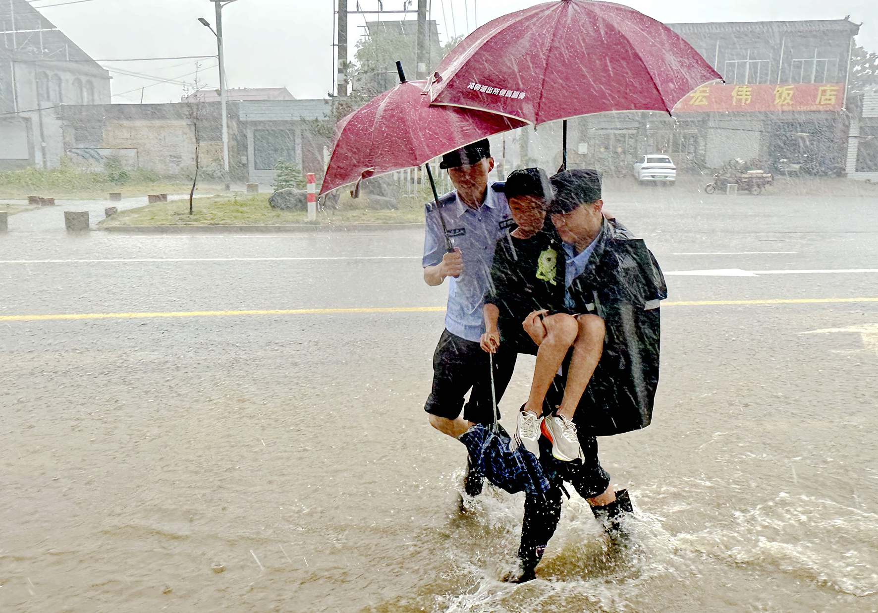 7月1日,山東省棗莊市公安局山亭分局馮卯派出所民輔警冒著暴雨將一名被困兒童安全護送到家。