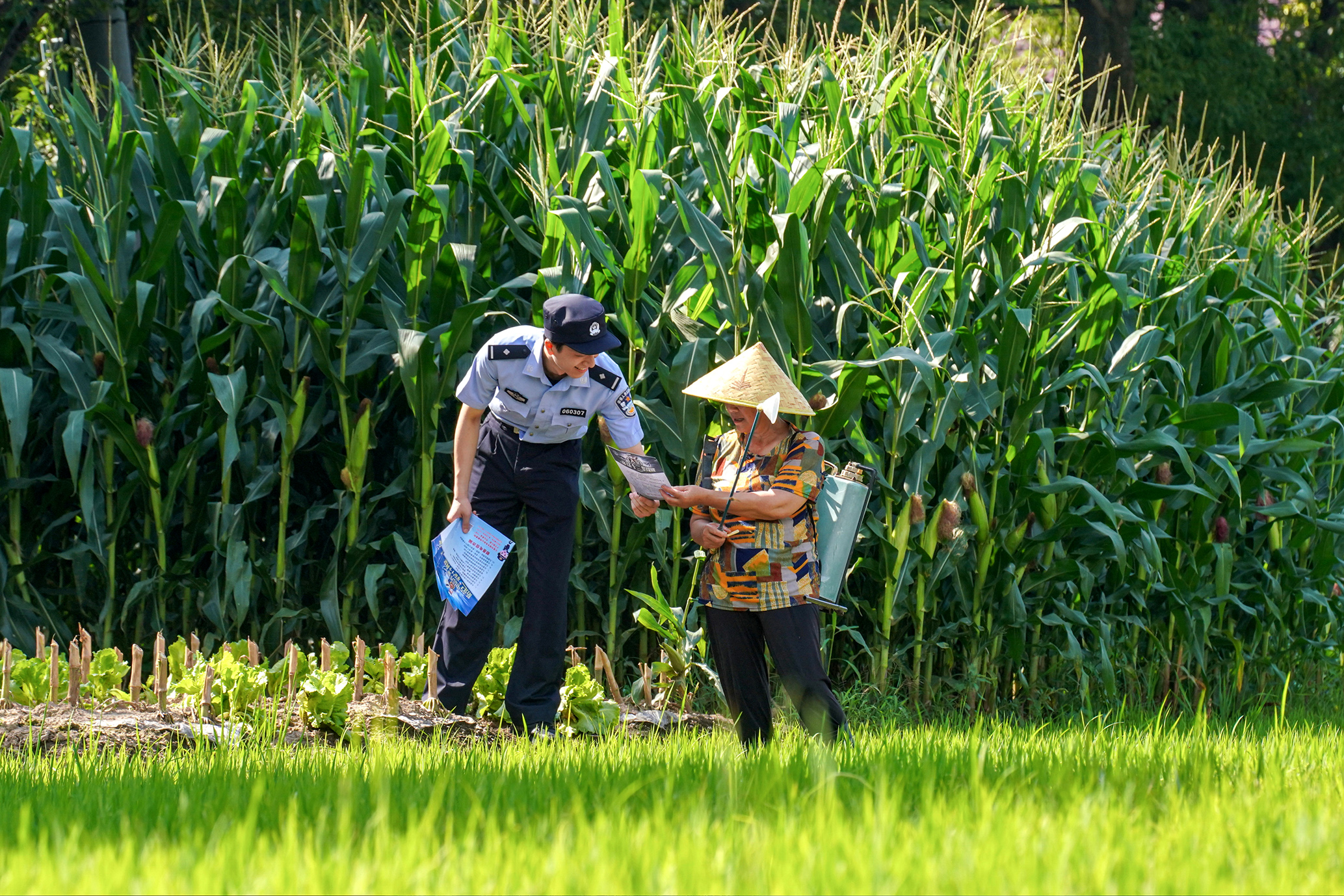7月3日,上海市公安局崇明分局城橋派出所民警頂著高溫天氣來到轄區(qū)田間地頭,向正在勞作的農(nóng)戶們開展防范電信網(wǎng)絡(luò)詐騙宣傳。