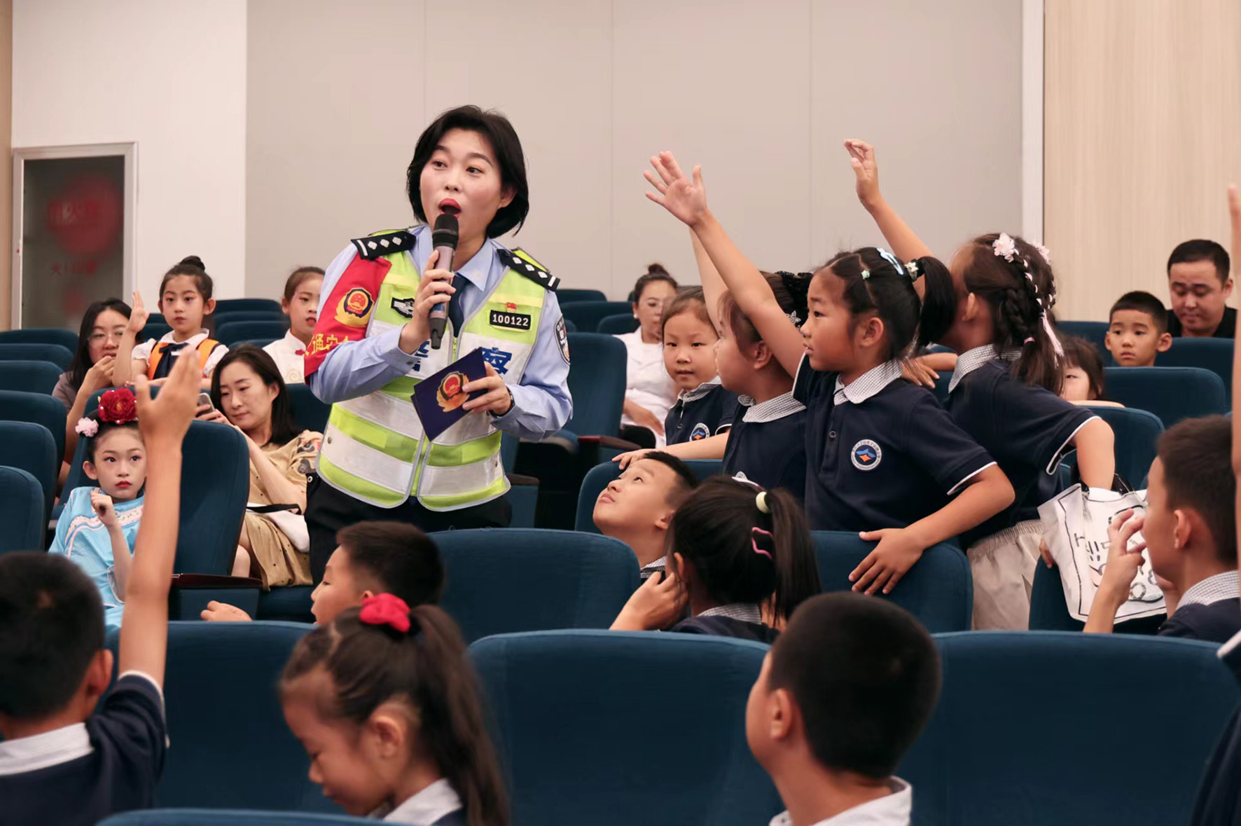 圖為7月11日,民警與學(xué)生們互動學(xué)習(xí)交通知識。