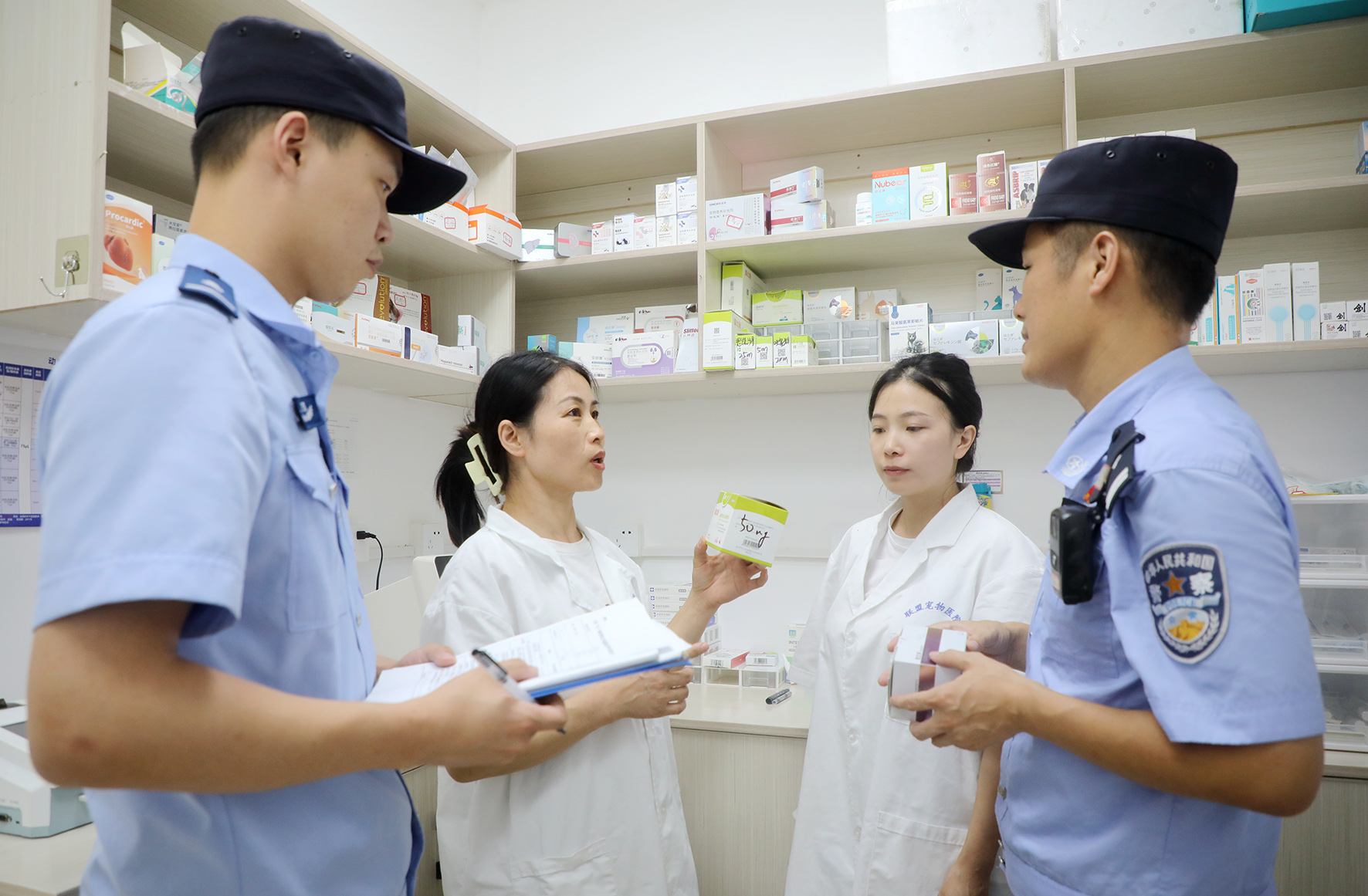 7月15日,江西省九江市公安局潯陽(yáng)分局民警輔警通過(guò)實(shí)地查看、查閱銷(xiāo)售臺(tái)賬、現(xiàn)場(chǎng)詢問(wèn)等方式,開(kāi)展獸用麻醉藥品和獸用精神藥品排查檢查。