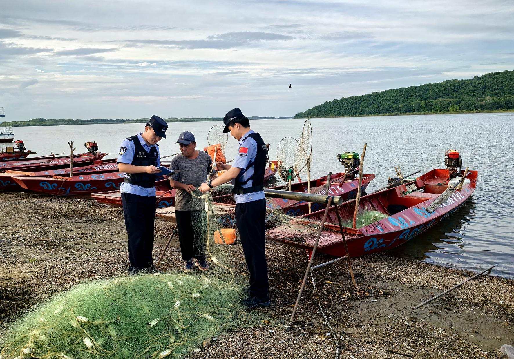圖為7月28日,饒河縣公安局四排邊境派出所民警在四排赫哲族鄉(xiāng)邊境水域進(jìn)行治安巡查,向漁民開(kāi)展邊境法律法規(guī)宣傳。