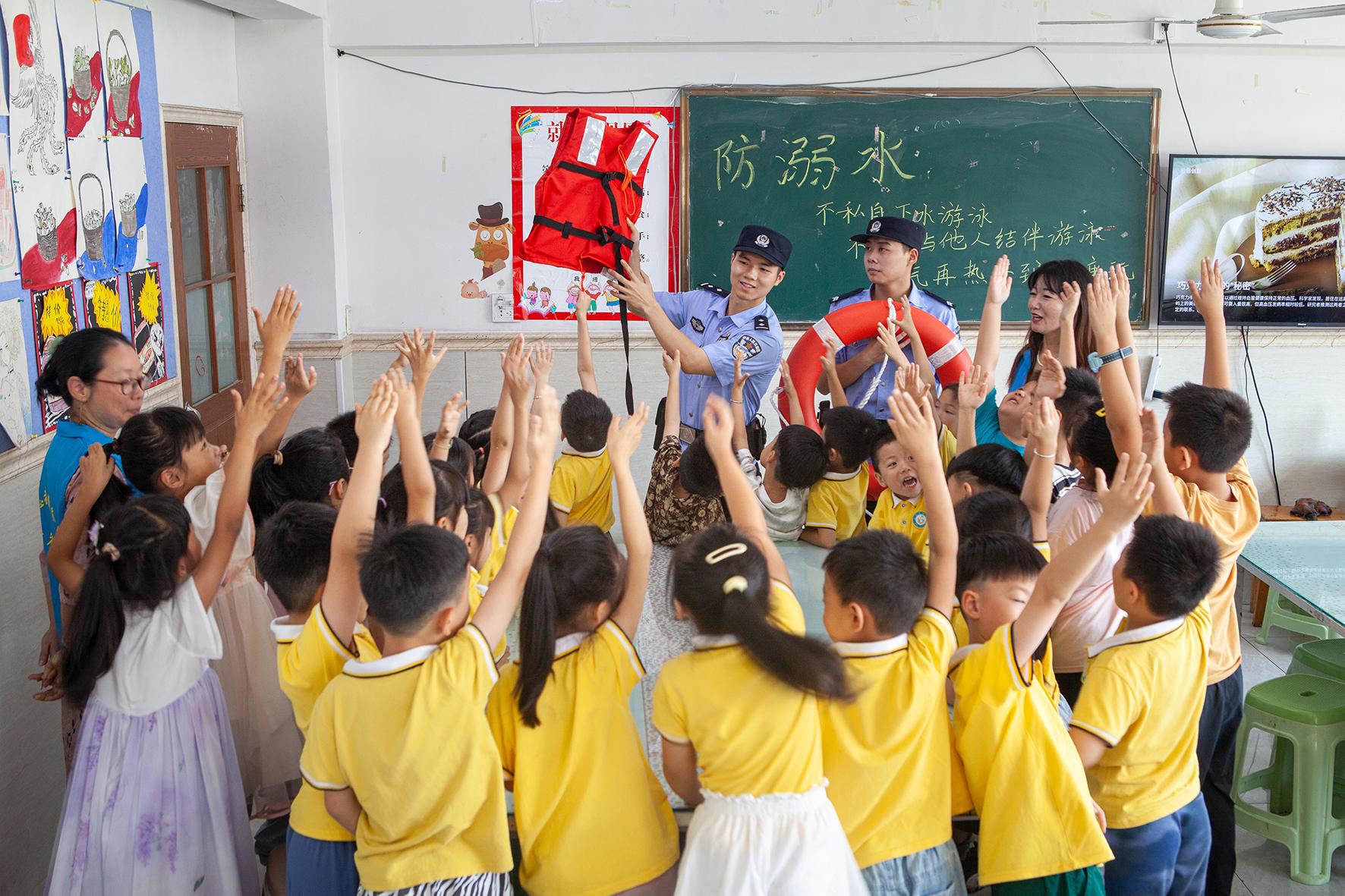8月12日,浙江省臺州市公安局黃巖分局江口派出所民警來到轄區(qū)內(nèi)的涵藝文創(chuàng)園,給參加暑期培訓(xùn)的小朋友們開展防溺水宣傳,提升他們的防范意識。
