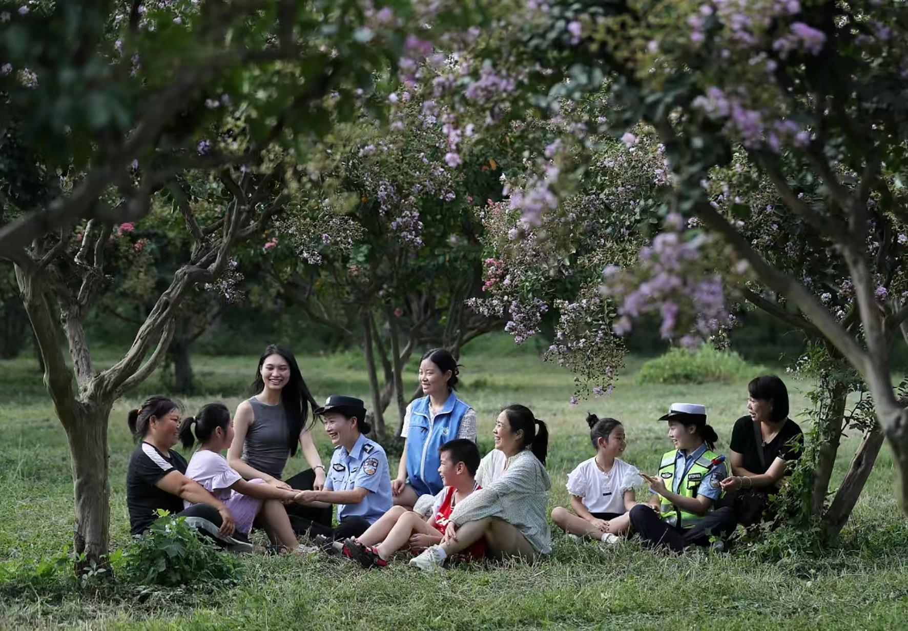 8月15日,湖北省鐘祥市公安局“巾幗護(hù)蕾”小分隊(duì)在皇莊街道皇城社區(qū)通過心理團(tuán)體輔導(dǎo)游戲,向社區(qū)婦女和兒童普及未成年人心理健康教育知識。