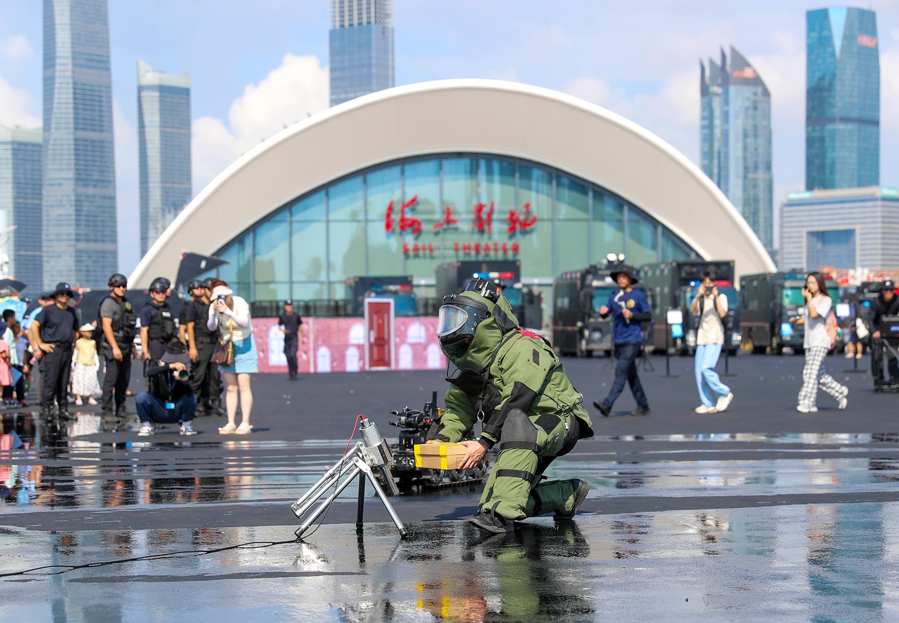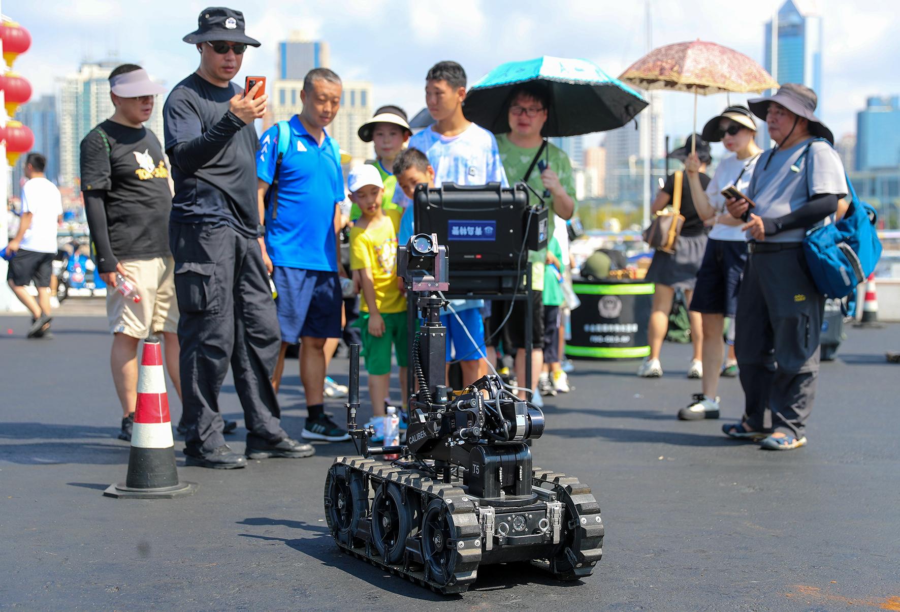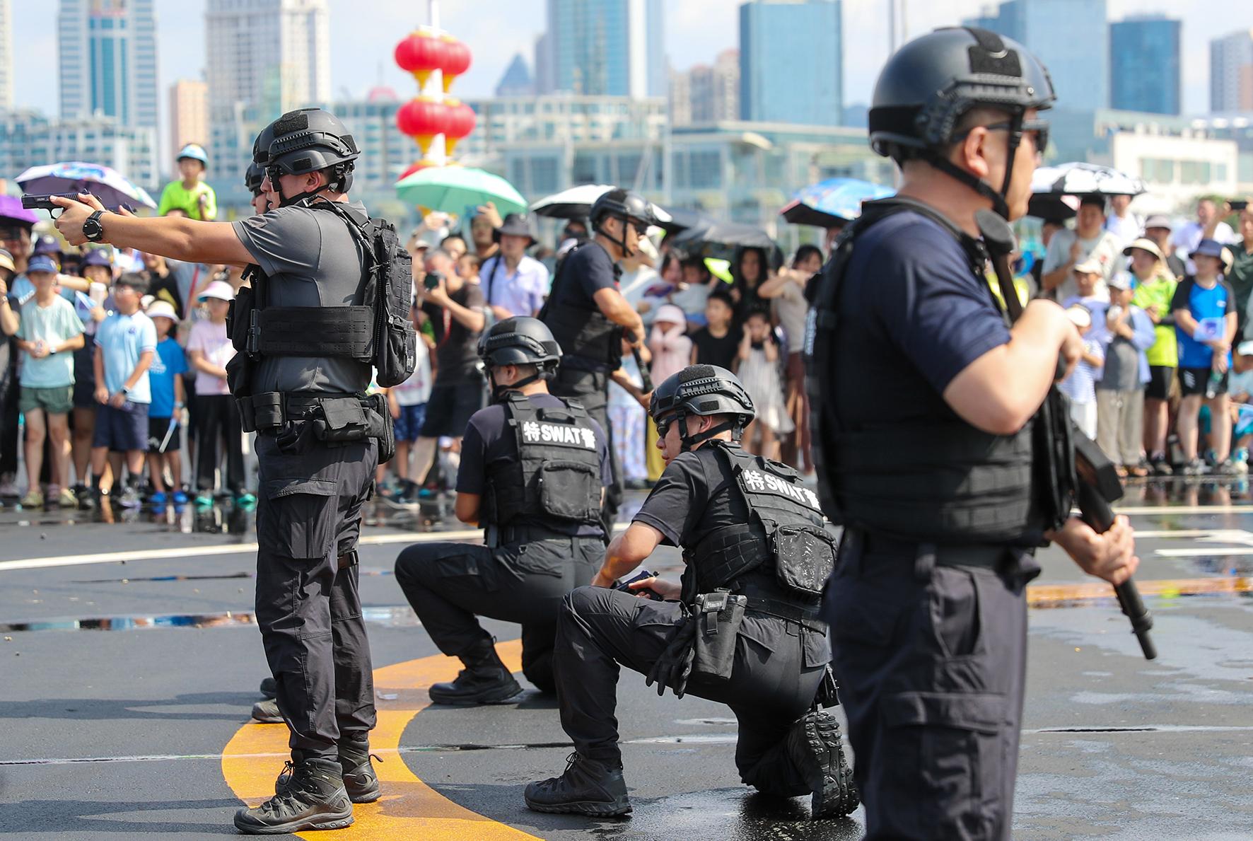 8月18日,山東省青島市公安局特警警營開放日活動在青島奧林匹克帆船中心舉行,相關(guān)警種設(shè)置展臺與市民互動,并進行警務(wù)技能演示和警務(wù)裝備展示。
