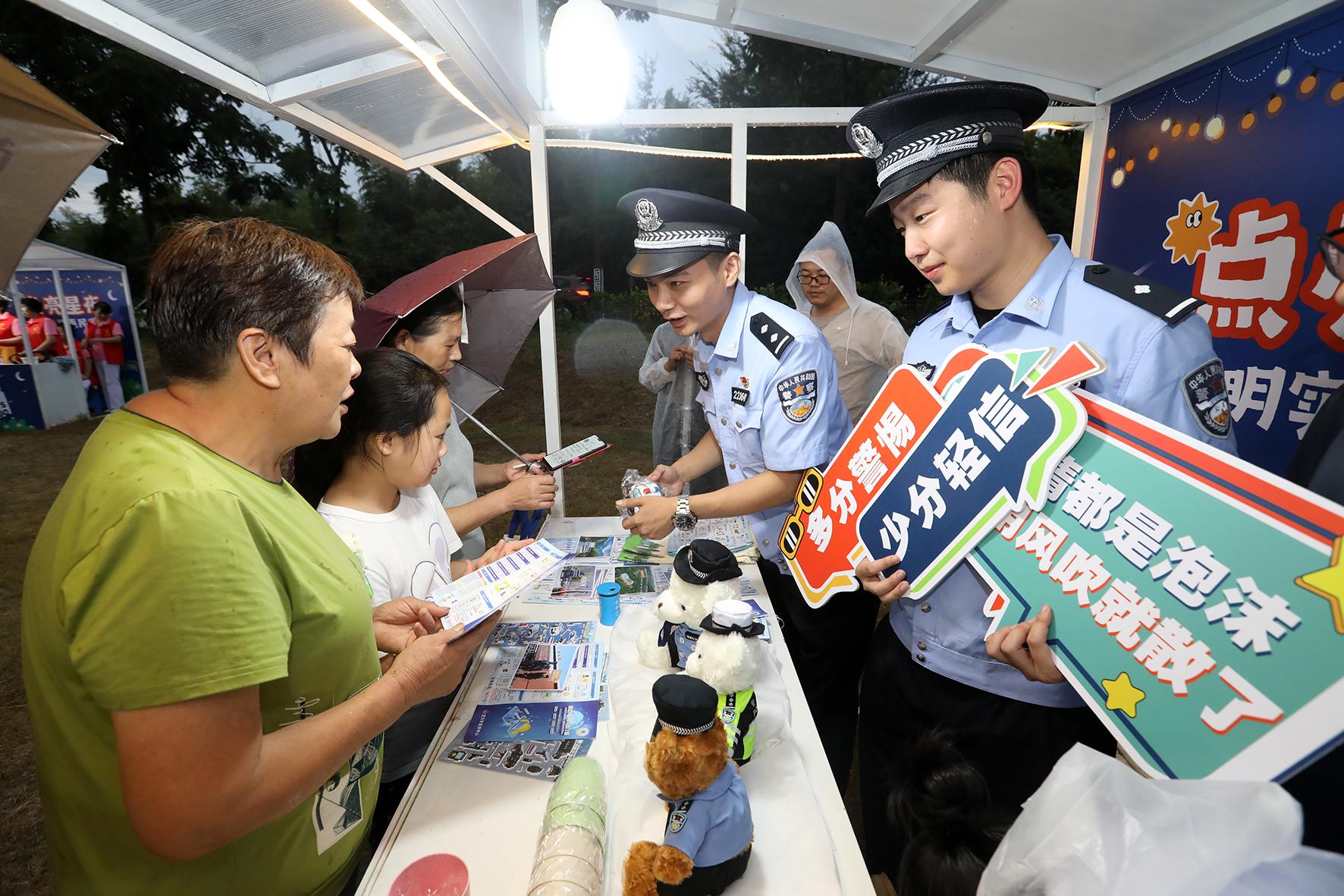 8月19日,江蘇省宜興市公安局太華派出所民警在“點(diǎn)亮星夜”文明實(shí)踐惠民夜集活動(dòng)現(xiàn)場(chǎng)向群眾講解反詐和禁毒知識(shí),提高群眾防騙和禁毒意識(shí)。