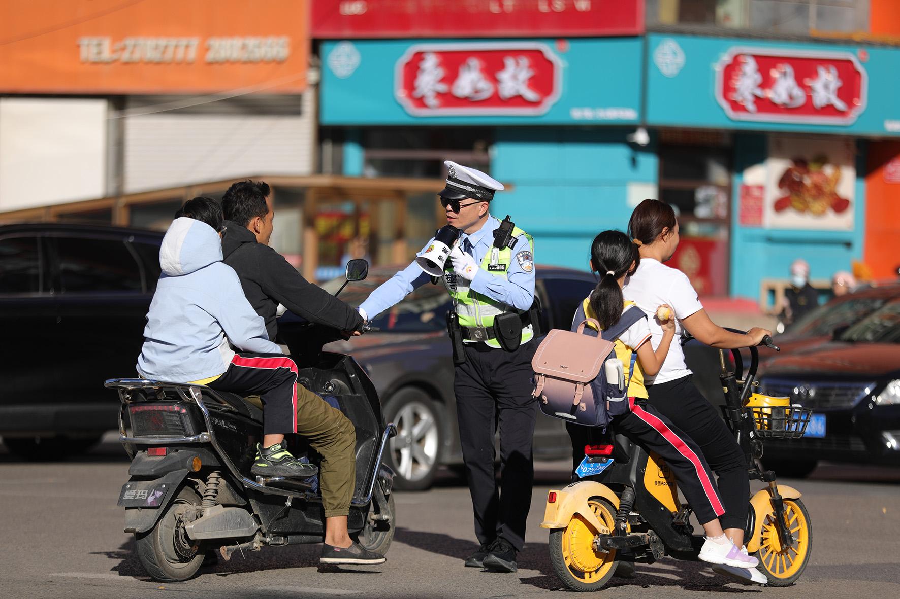 9月12日,遼寧省阜新市公安局交警支隊(duì)海州大隊(duì)民警叫停糾正不戴頭盔的駕駛?cè)耍梦拿鲃駥?dǎo)的方式為城市交通筑起安全防線,讓出行更安全、有序、文明。