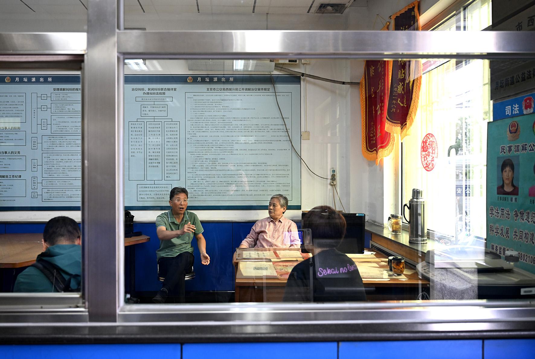 在月壇派出所調(diào)解室,法官趙海(中)圍繞人民調(diào)解協(xié)議中常見糾紛類型、遇到的共性問題給兩位調(diào)解員進行專業(yè)指導(dǎo)。