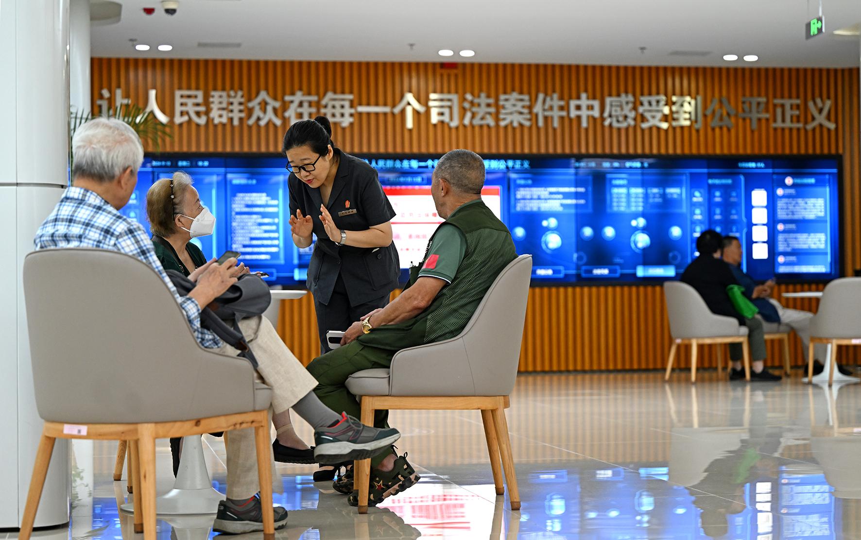 “您好,我是訴訟服務(wù)中心的‘大廳經(jīng)理’,看您幾位在商量著,是哪些事項不太清楚怎么辦嗎?”9月10日,北京市西城區(qū)人民法院立案庭訴服團隊導(dǎo)訴組的組長杜春看到大廳里的幾位老人圍桌而坐,便主動上前看看能幫上什么忙。