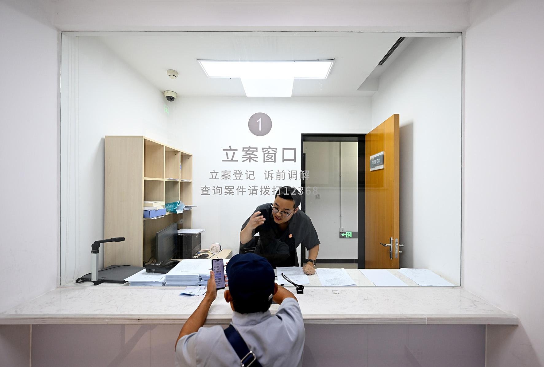 法官助理劉鑫鵬在立案窗口耐心細致地審核當(dāng)事人的立案材料。