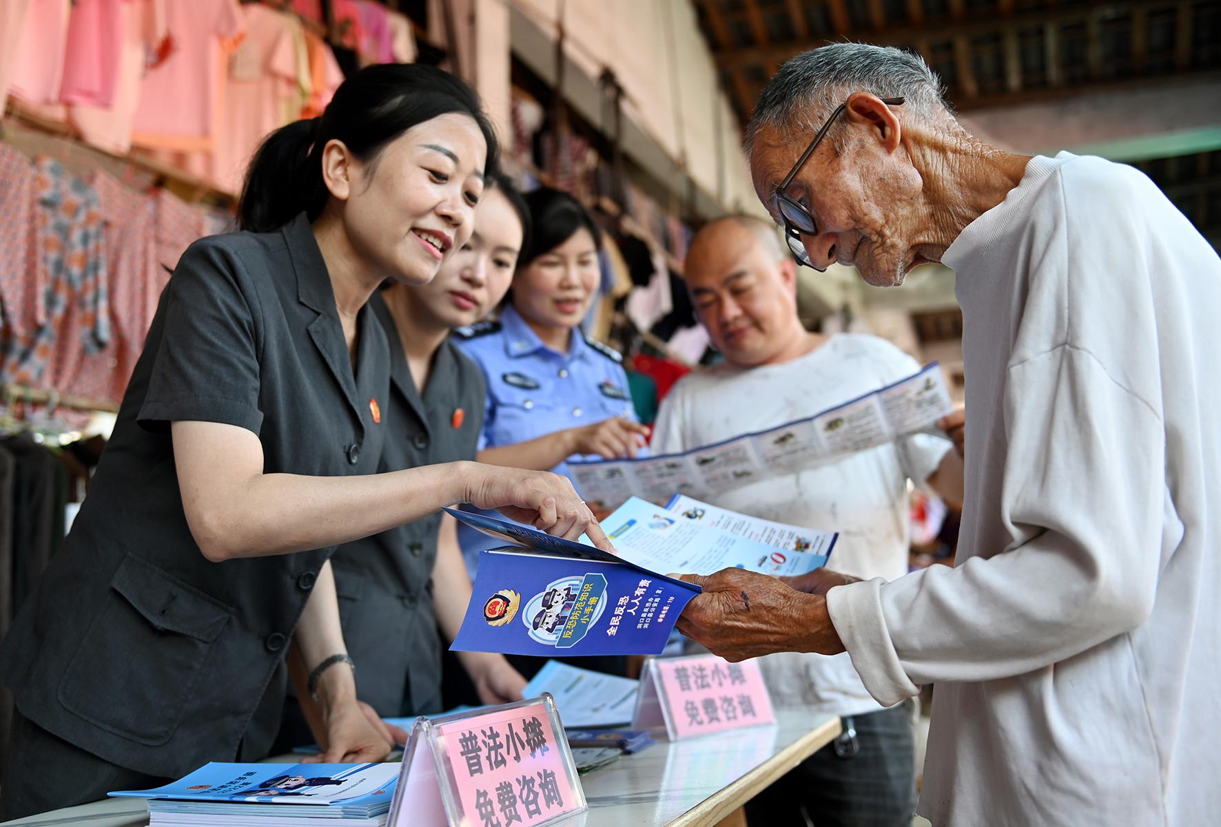 9月19日,湖南省洞口縣人民法院干警在楊林鎮(zhèn)農(nóng)貿(mào)市場向群眾宣講法律知識。連日來,洞口縣人民法院干警利用當(dāng)?shù)剜l(xiāng)村趕集日,向群眾宣講防范非法集資、反詐、民法典等法律知識。