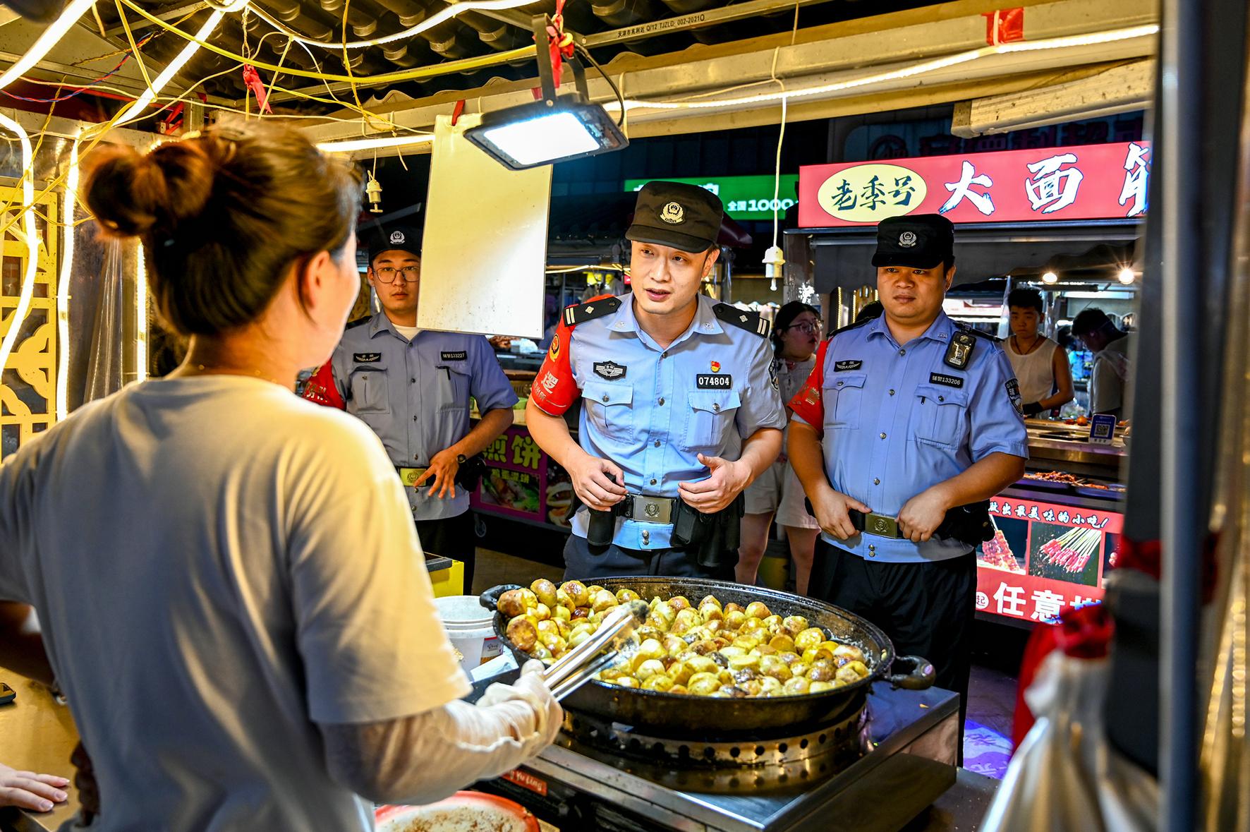 9月23日晚,安徽省馬鞍山市和縣公安局民警正在開展夜間巡邏,向市民了解治安狀況,聽取群眾對公安工作的意見和建議。今年以來,該縣公安機(jī)關(guān)全面落實(shí)“見警力、見警車、見警燈”工作要求,對重點(diǎn)區(qū)域、重點(diǎn)時段開展巡邏管控,全力提升群眾的安全感。
