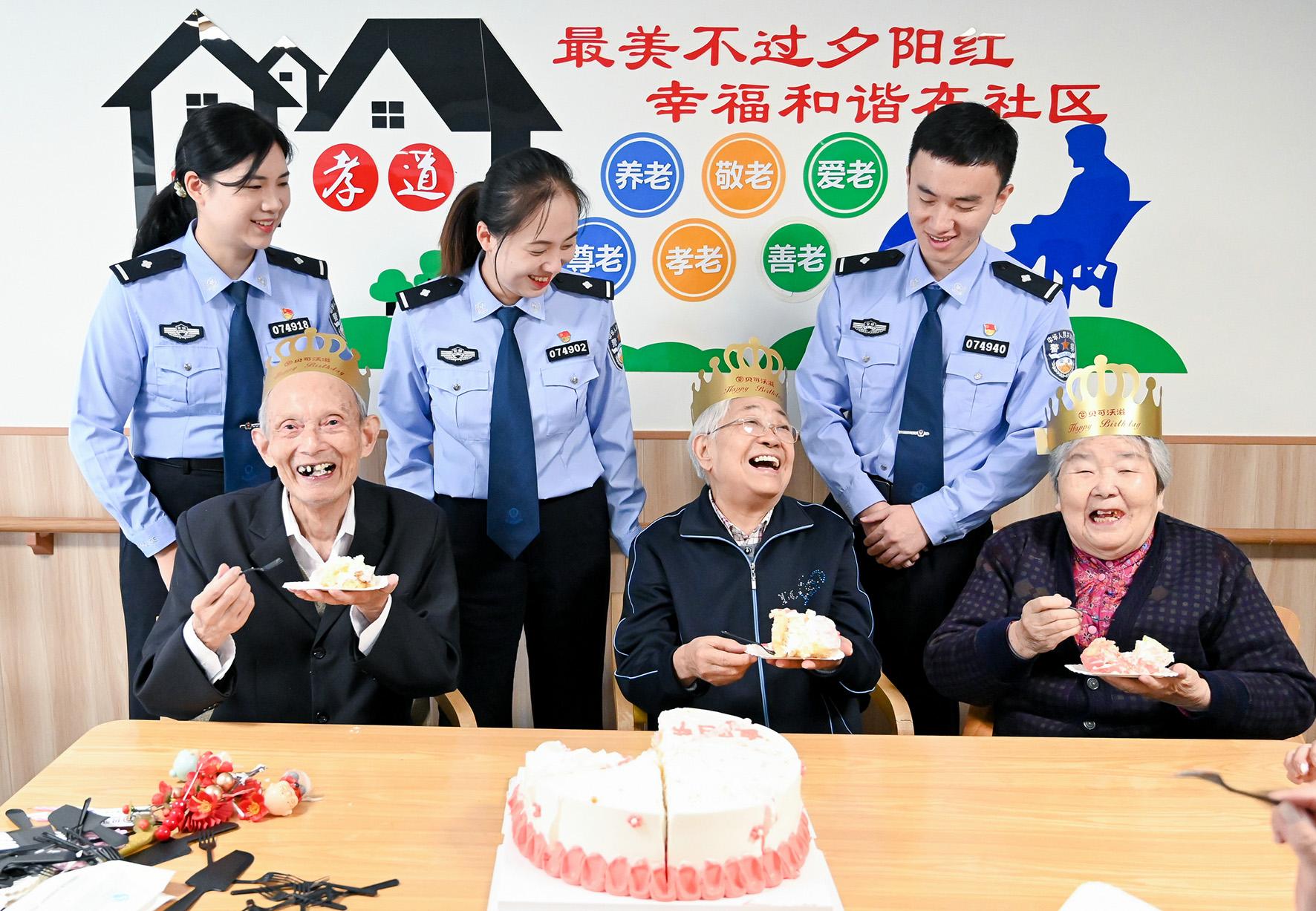 10月10日,安徽省馬鞍山市和縣公安局民警在蓮邦養(yǎng)老院與老人們喜迎重陽節(jié),開展防范網(wǎng)絡(luò)詐騙等普法宣傳。
