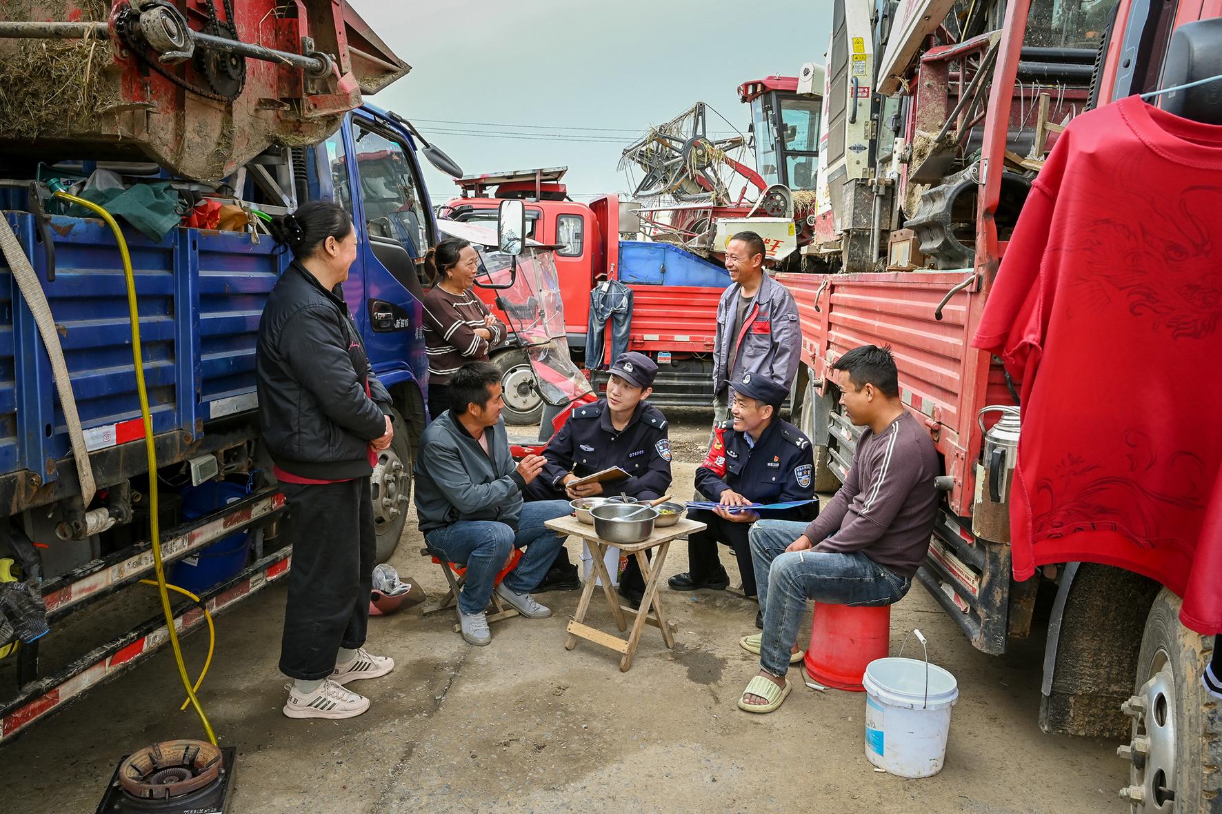 10月21日,安徽省和縣公安局民警向來自江蘇省宿遷市的收割機手開展防盜、防詐騙和防矛盾糾紛宣傳,同時發(fā)放警民聯(lián)系卡,全力守護秋收安全。