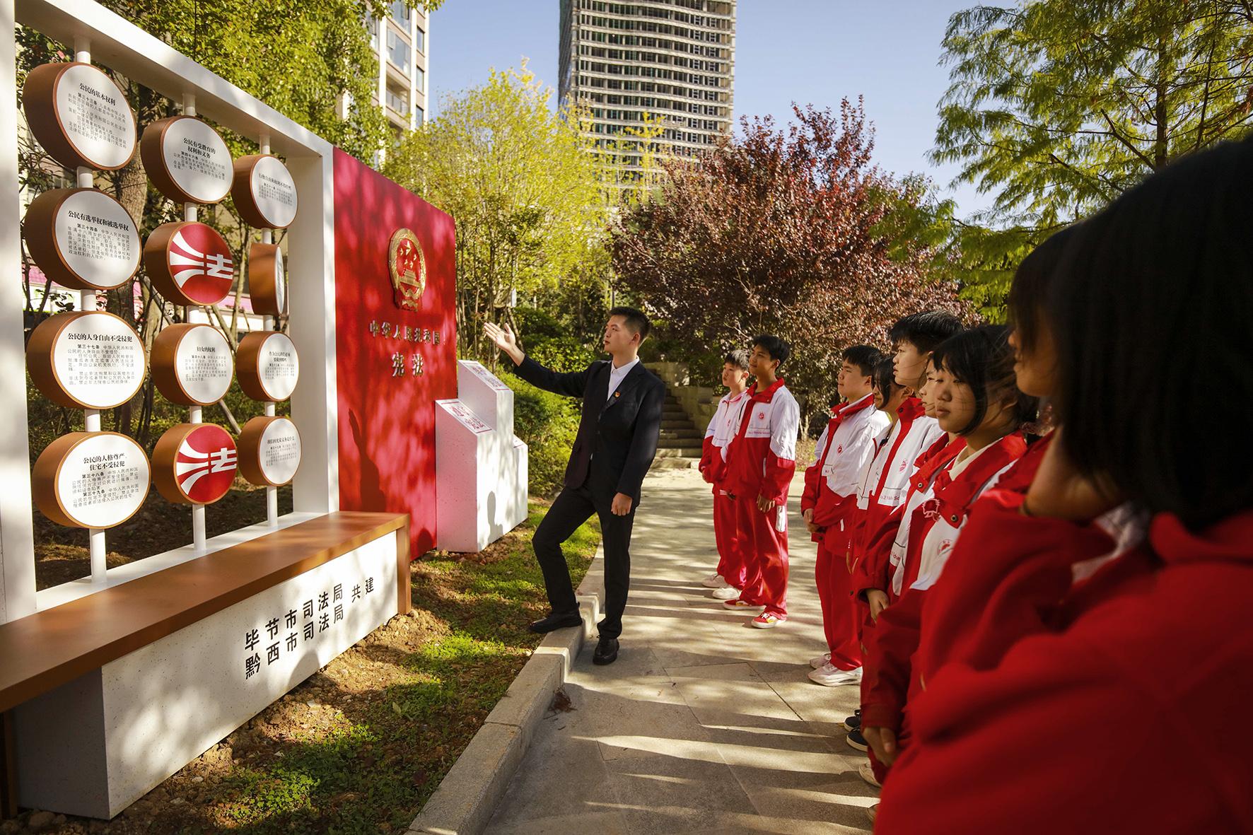 10月23日,貴州省黔西市第二中學(xué)的學(xué)生走進(jìn)蓮城街杜鵑湖法治公園,開展沉浸式學(xué)習(xí)法治知識。