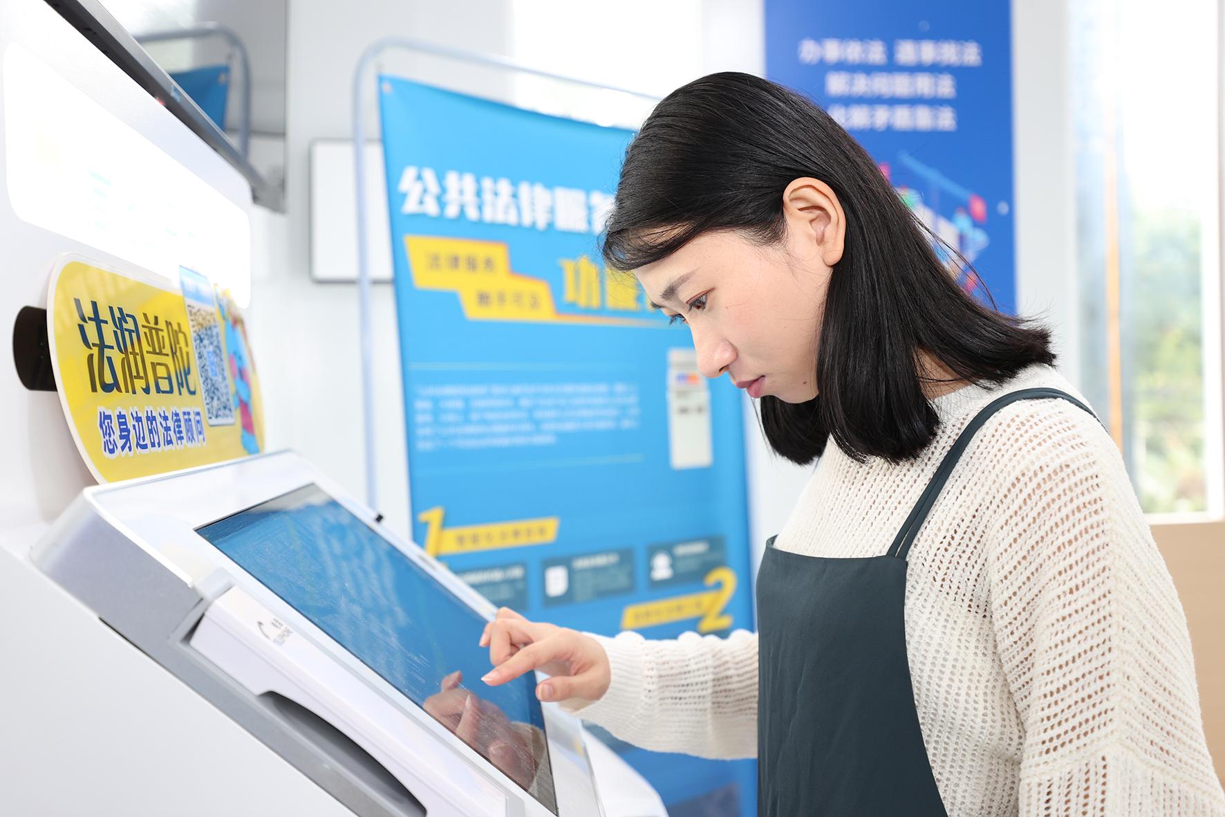 10月28日,浙江省舟山市普陀區(qū)市民正在24小時法超市內(nèi)使用公共法律服務(wù)自助機辦理相關(guān)業(yè)務(wù)。