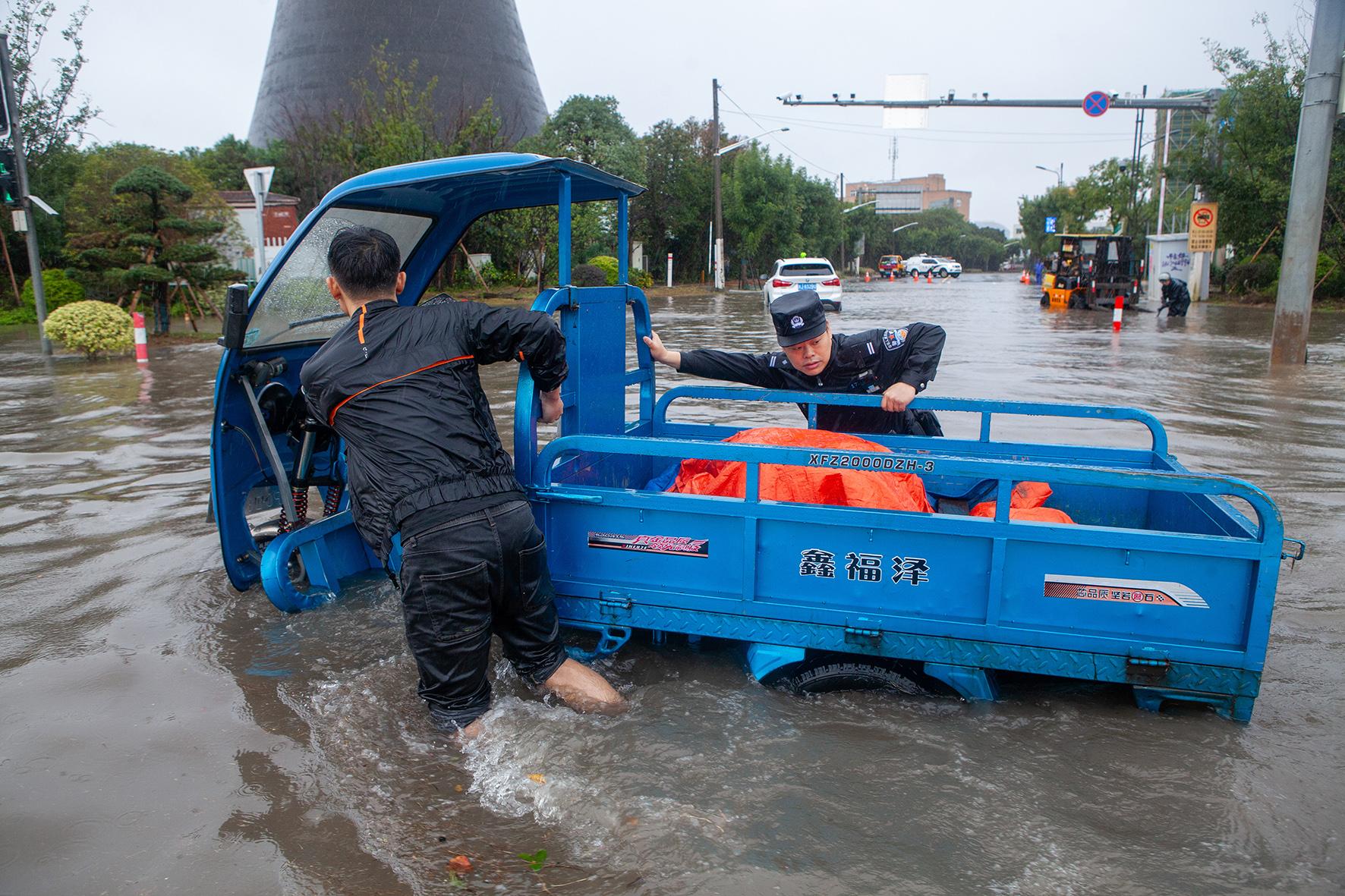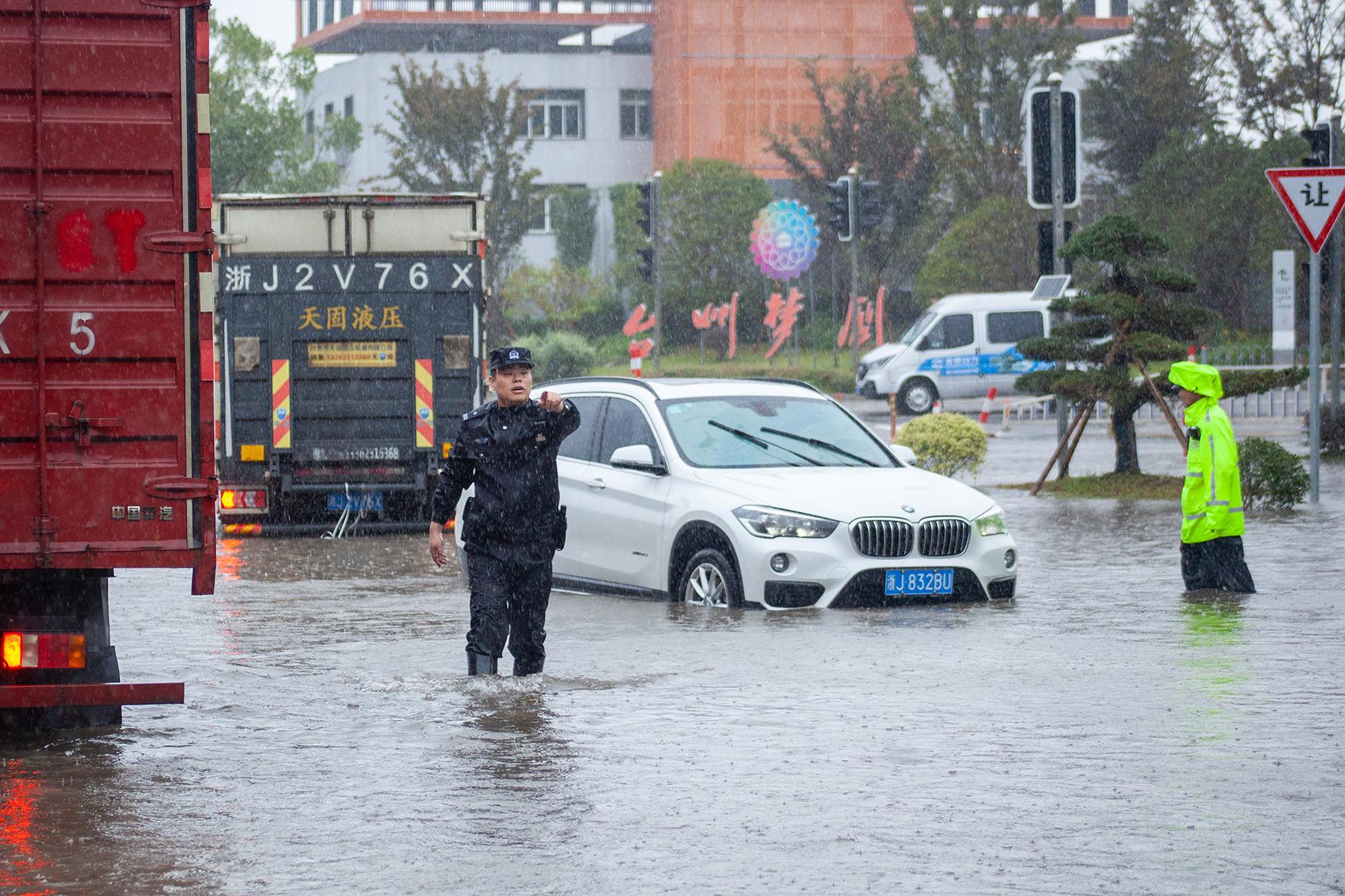11月1日,臺風“康妮”帶來的暴雨使浙江省臺州市黃巖區(qū)部分路段積水嚴重。臺州市公安局黃巖分局全力應對,做好救援車輛、轉(zhuǎn)移群眾工作。