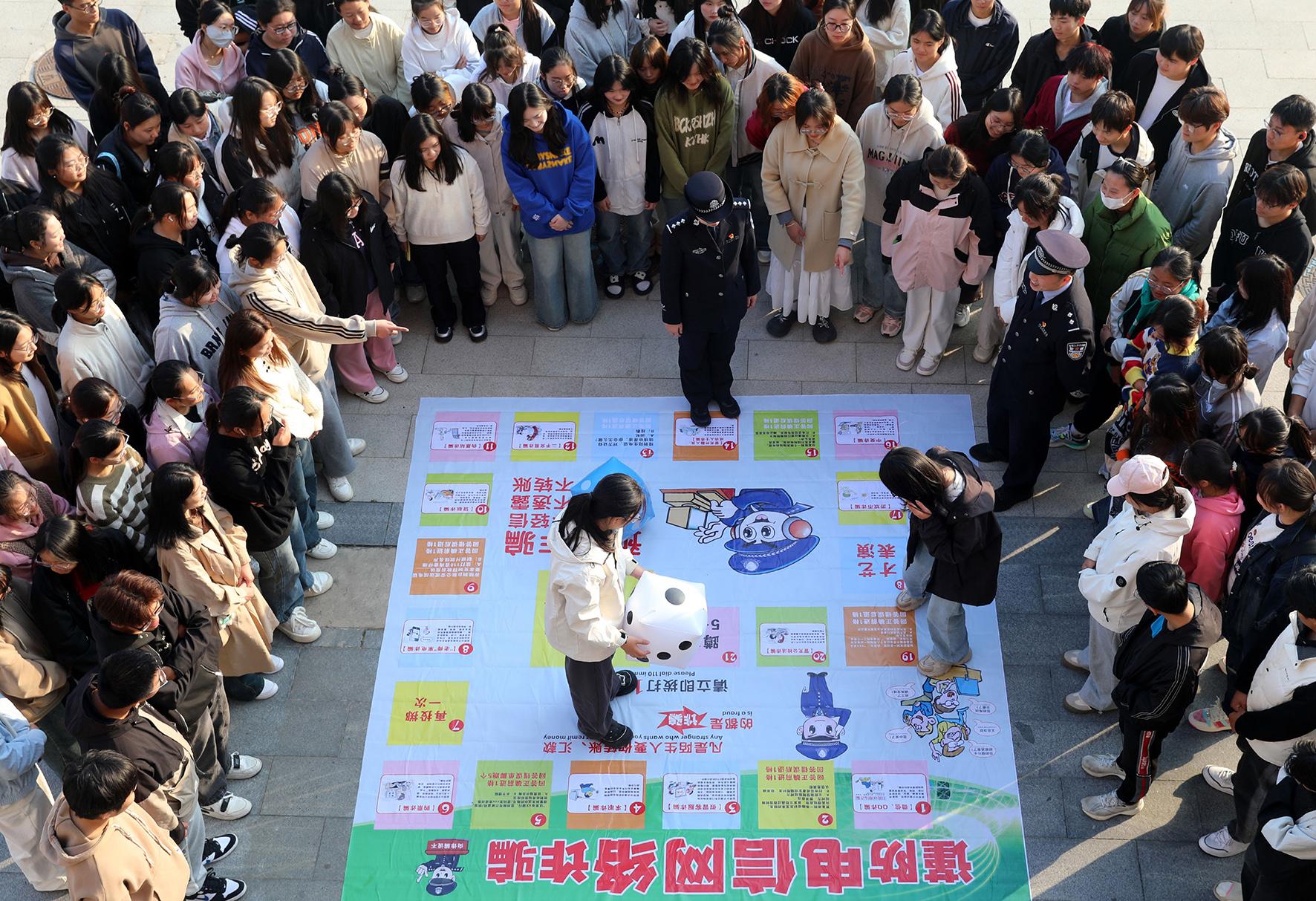 圖為民警組織師生進(jìn)行“反詐飛行棋”趣味游戲互動。