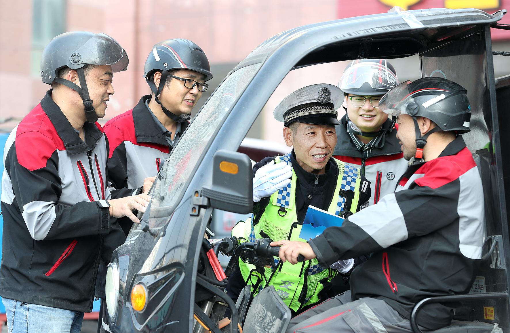 連日來,荊門市公安局交警支隊組織民警在各大快遞公司開展“一盔一帶”安全守護行動,民警通過“臺上授課”“臺下交流”等形式,向快遞員宣傳道路交通安全知識。