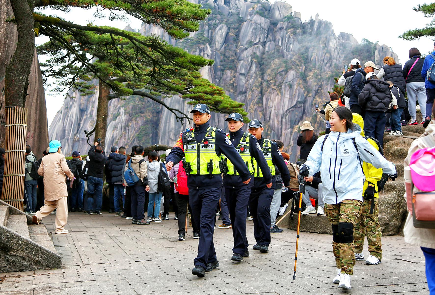 11月19日,安徽省黃山風(fēng)景區(qū)公安局玉屏樓派出所執(zhí)勤民警輔警在秀美風(fēng)景中執(zhí)勤,也成為游客眼中的一道亮麗風(fēng)“警”線。