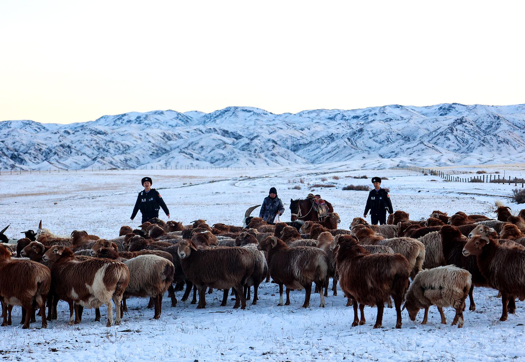 11月20日,新疆出入境邊防檢查總站阿勒泰邊境管理支隊托普鐵熱克邊境派出所民警深入牧民定居點,了解冬季轉(zhuǎn)場路線和時間,勘察沿途路段,為牧民提供食物、藥品等物資,全程護航牧民冬季轉(zhuǎn)場。