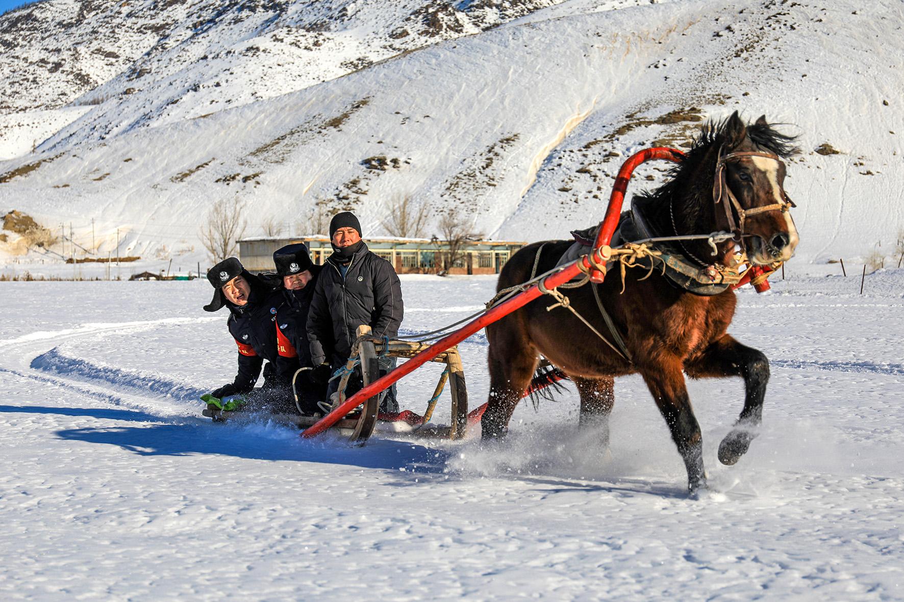 12月8日,新疆阿勒泰地區(qū)因降雪給部分村莊農(nóng)戶日常出行造成不便。新疆出入境邊防檢查總站阿勒泰邊境管理支隊(duì)庫(kù)衛(wèi)邊境派出所民警和護(hù)邊員采取馬拉爬犁的方式,走訪轄區(qū)群眾,梳理群眾困難需求,并對(duì)困難農(nóng)戶開(kāi)展冬季慰問(wèn),保障轄區(qū)群眾平安過(guò)冬。