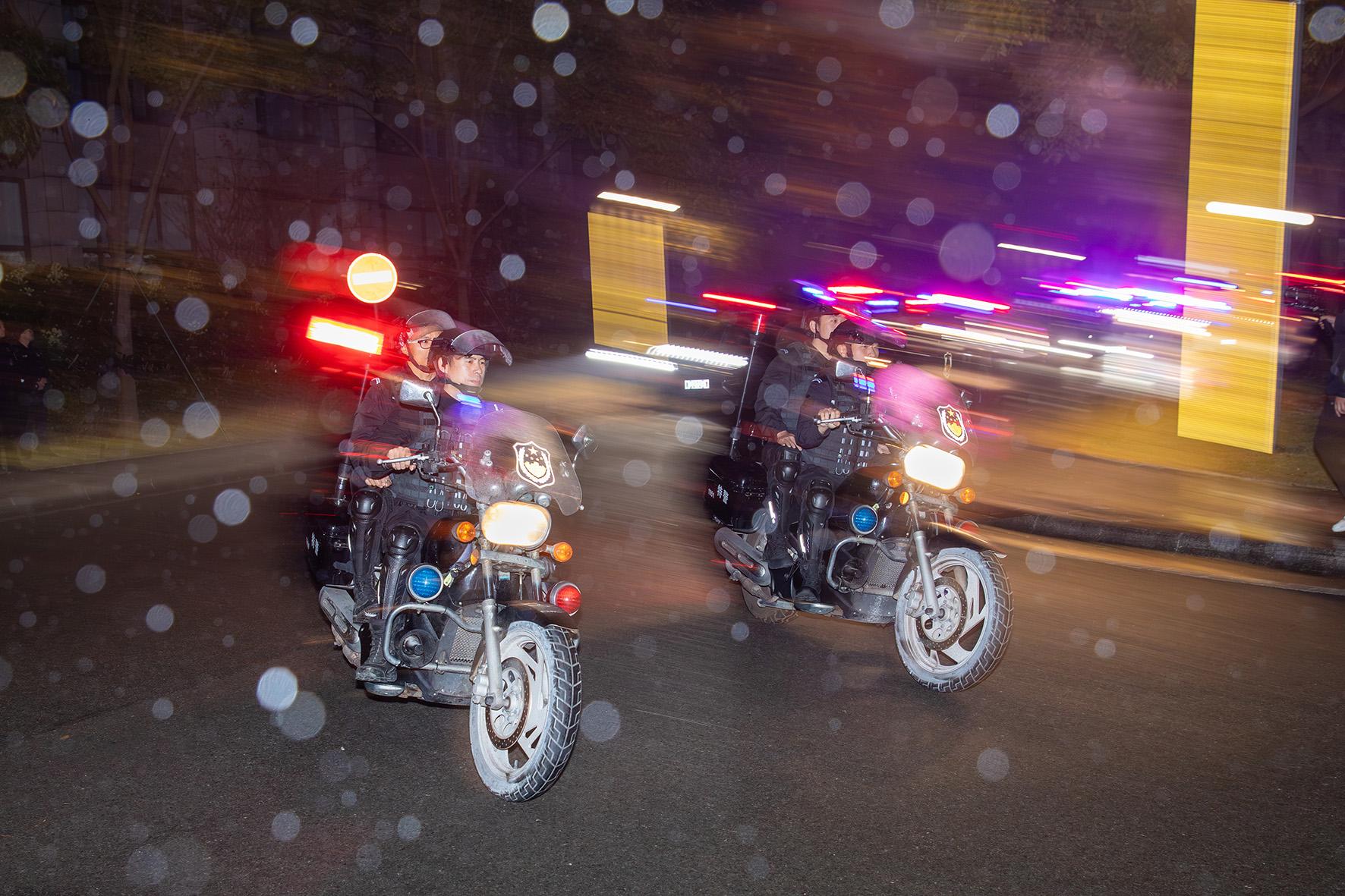 12月10日夜,浙江省臺(tái)州市公安局黃巖分局巡特警大隊(duì)隊(duì)員冒雨參加“冬季行動(dòng)”,分組在城區(qū)開展摩托車和步行巡邏,并在入城道口設(shè)卡盤查可疑車輛,守護(hù)冬夜的平安。