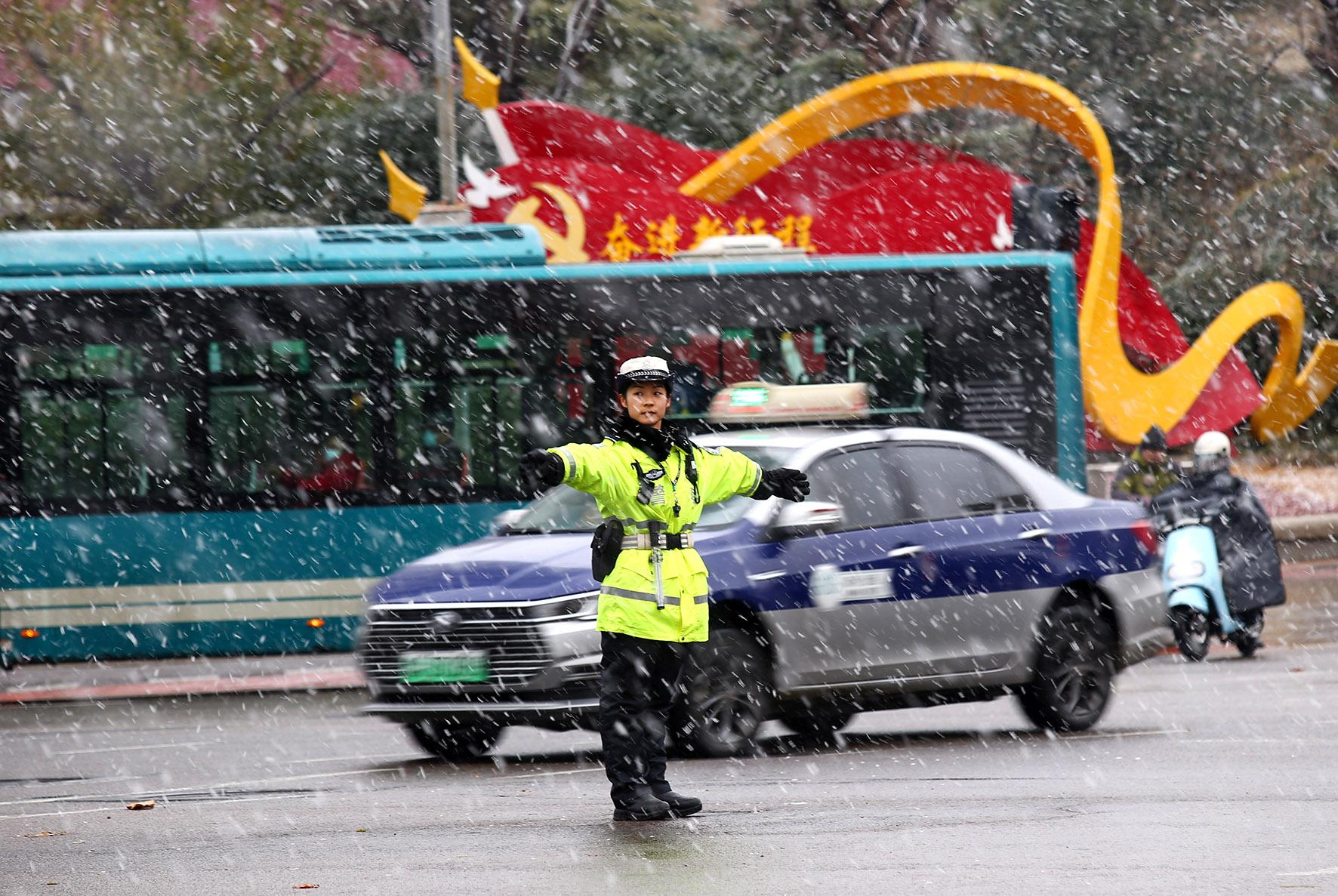 12月13日,山東省濟南市迎來降雪天氣。濟南市公安局交警支隊市中區(qū)大隊啟動惡劣天氣應(yīng)急預(yù)案,加大對重點路段、十字路口的交通疏導力度,為群眾安全出行保駕護航。