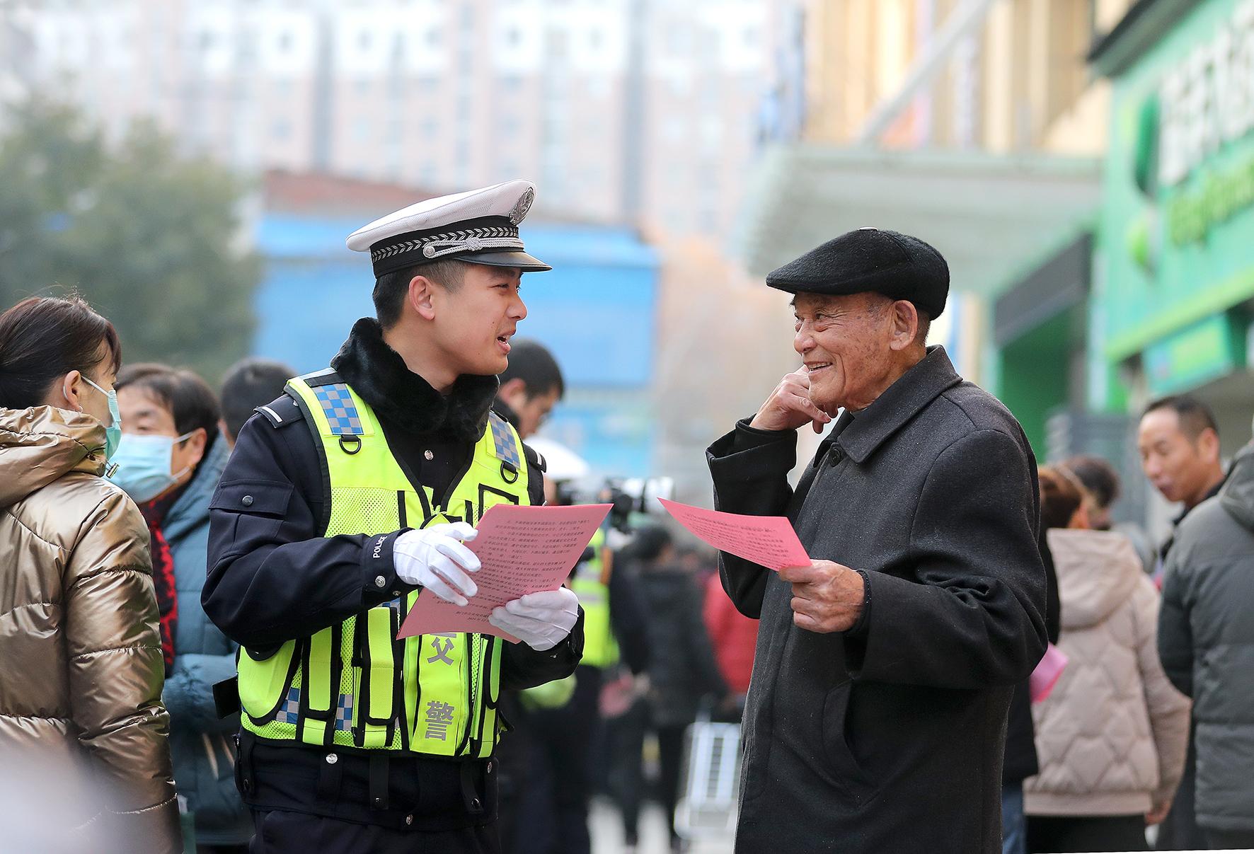 12月13日,湖北省荊門市公安局交警支隊東寶大隊民警在南臺菜市場,將《致老年交通參與者一封信》逐句地念給老年人聽,倡議老年朋友們自覺遵守交通法規(guī),平安出行。