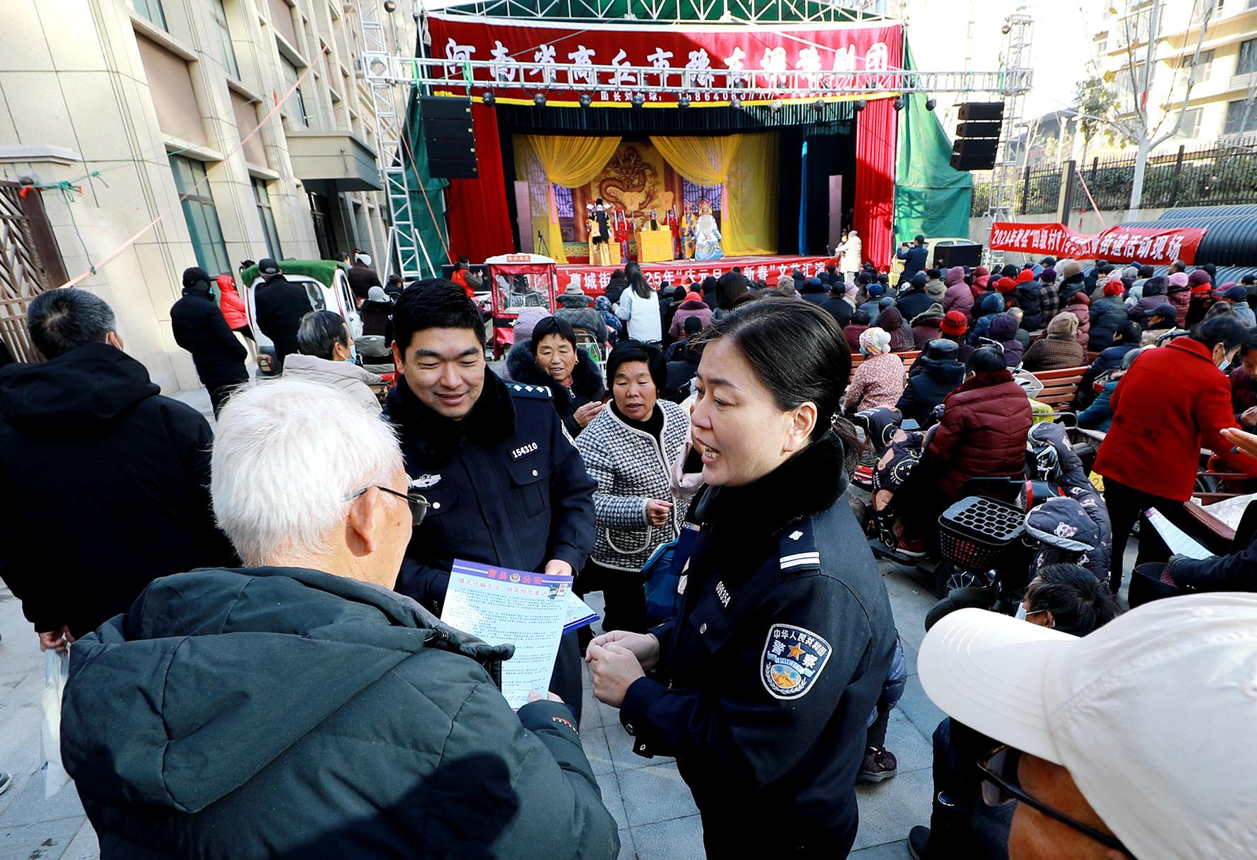 12月17日,山東省曹縣公安局曹城派出所民警利用送戲進(jìn)社區(qū)的有利時(shí)機(jī),開展反詐騙宣傳活動(dòng)。