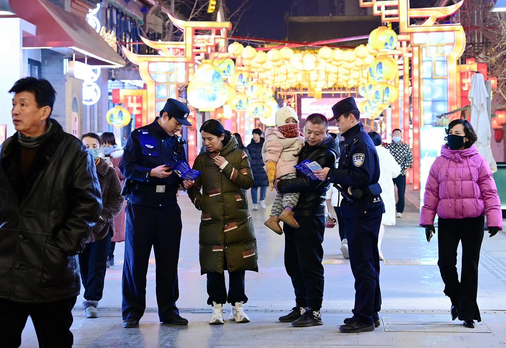 12月24日晚,甘肅省蘭州市公安局七里河分局土門墩派出所民警在蘭州老街巡邏,向游客宣傳反詐知識。
