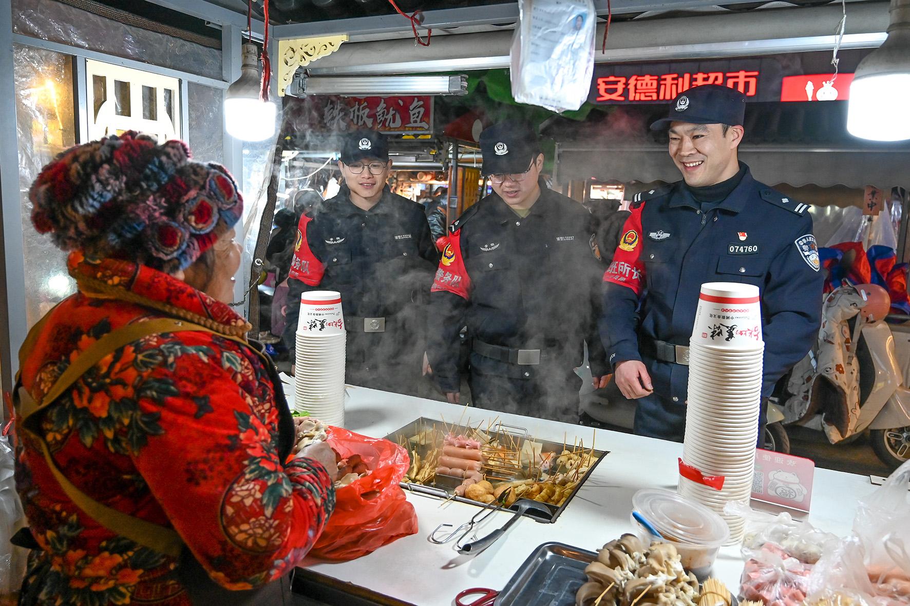 1月13日晚,安徽省馬鞍山市和縣公安局民警在美食街開展徒步巡邏,走訪經(jīng)營戶了解治安狀況,守護夜市平安。