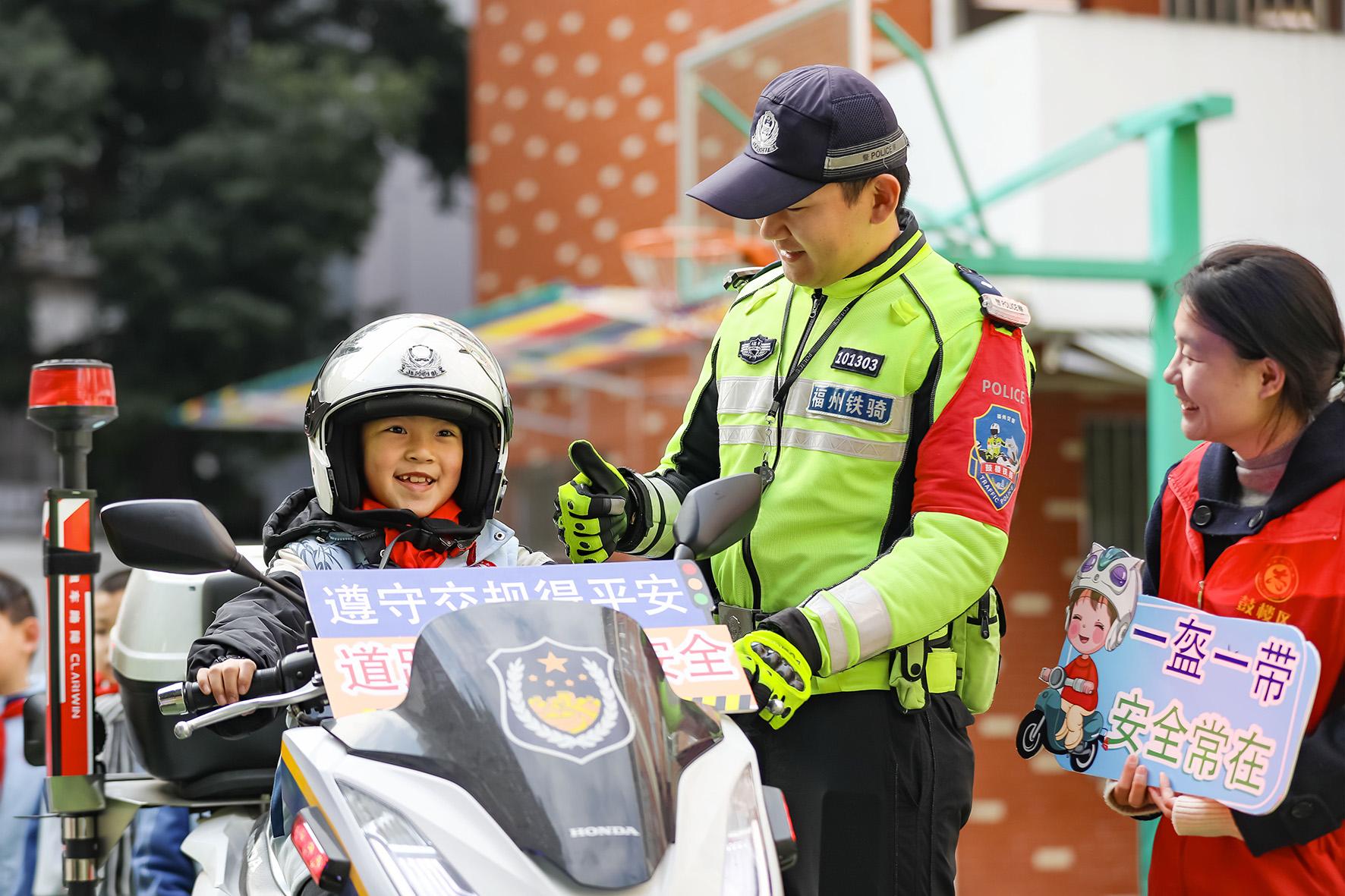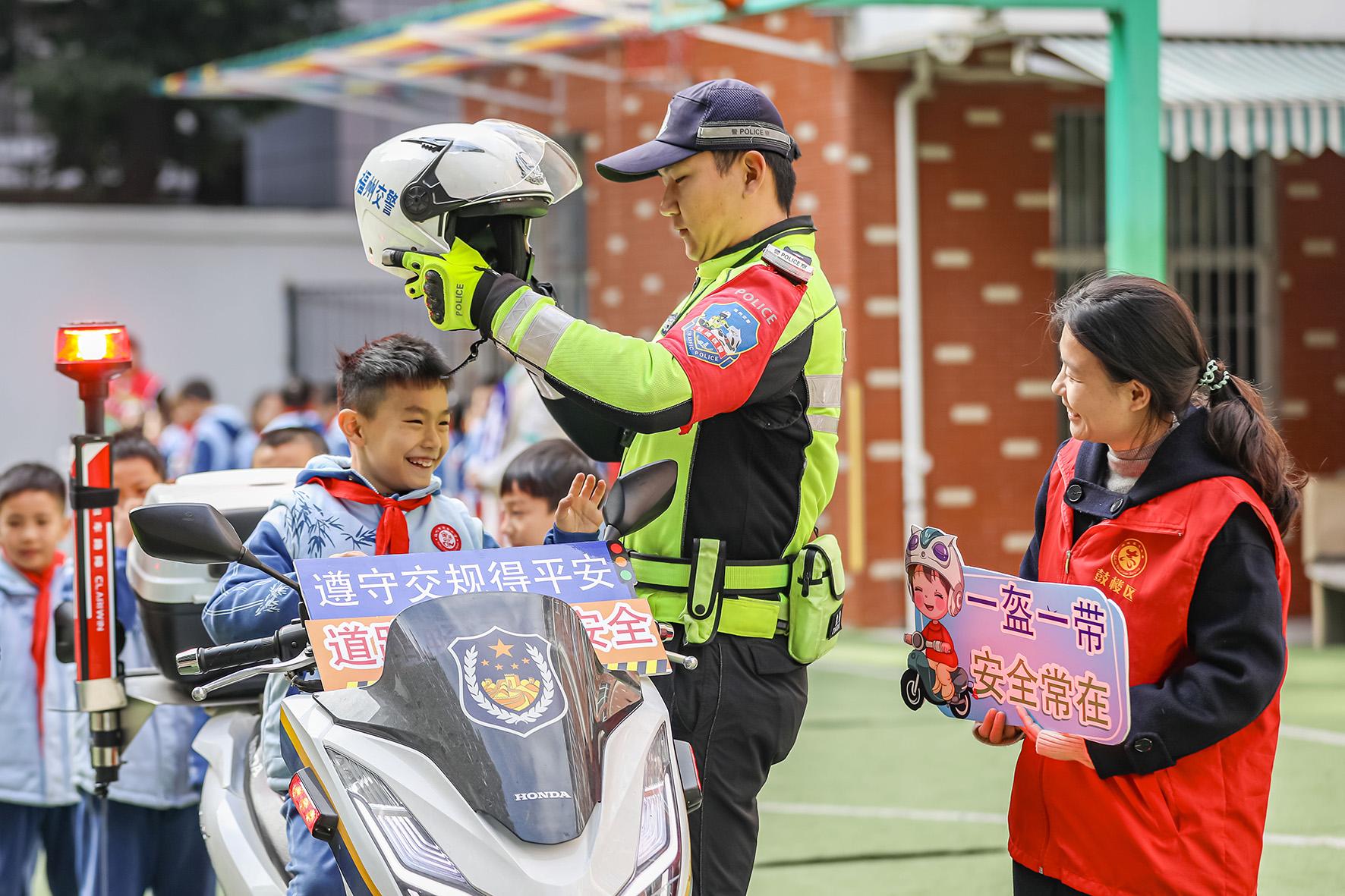 1月14日,福建省福州市公安局交警支隊鼓樓大隊民警、社區(qū)志愿者走進斗南小學(xué),開展“交通安全進校園 平安快樂度寒假”主題活動。