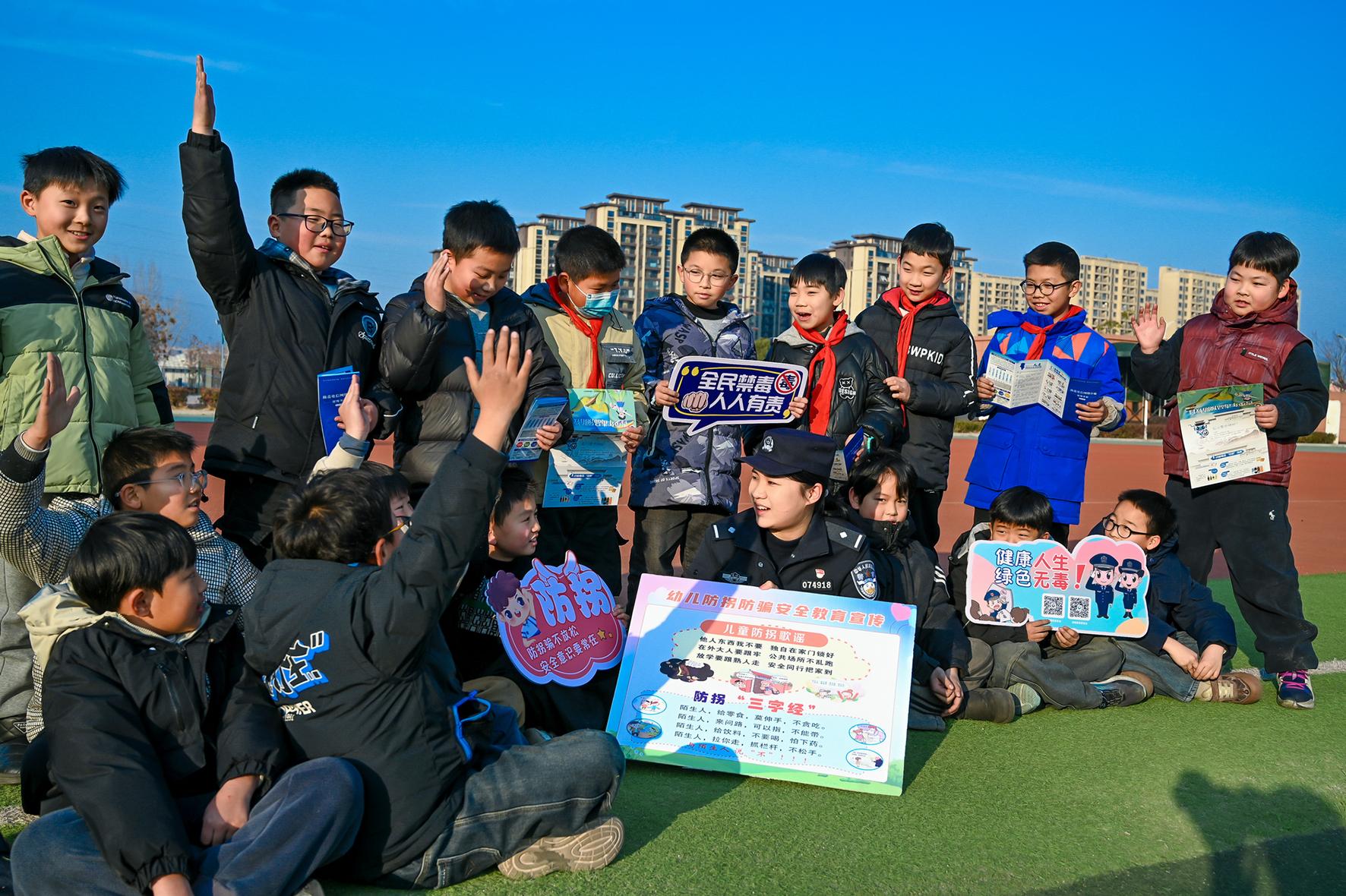 1月14日,在安徽省馬鞍山市和縣實驗小學,轄區(qū)歷陽派出所民警在給學生講解防拐、防騙、交通安全等知識。寒假來臨,該縣公安機關(guān)及時開展“假前最后一課”宣傳活動。