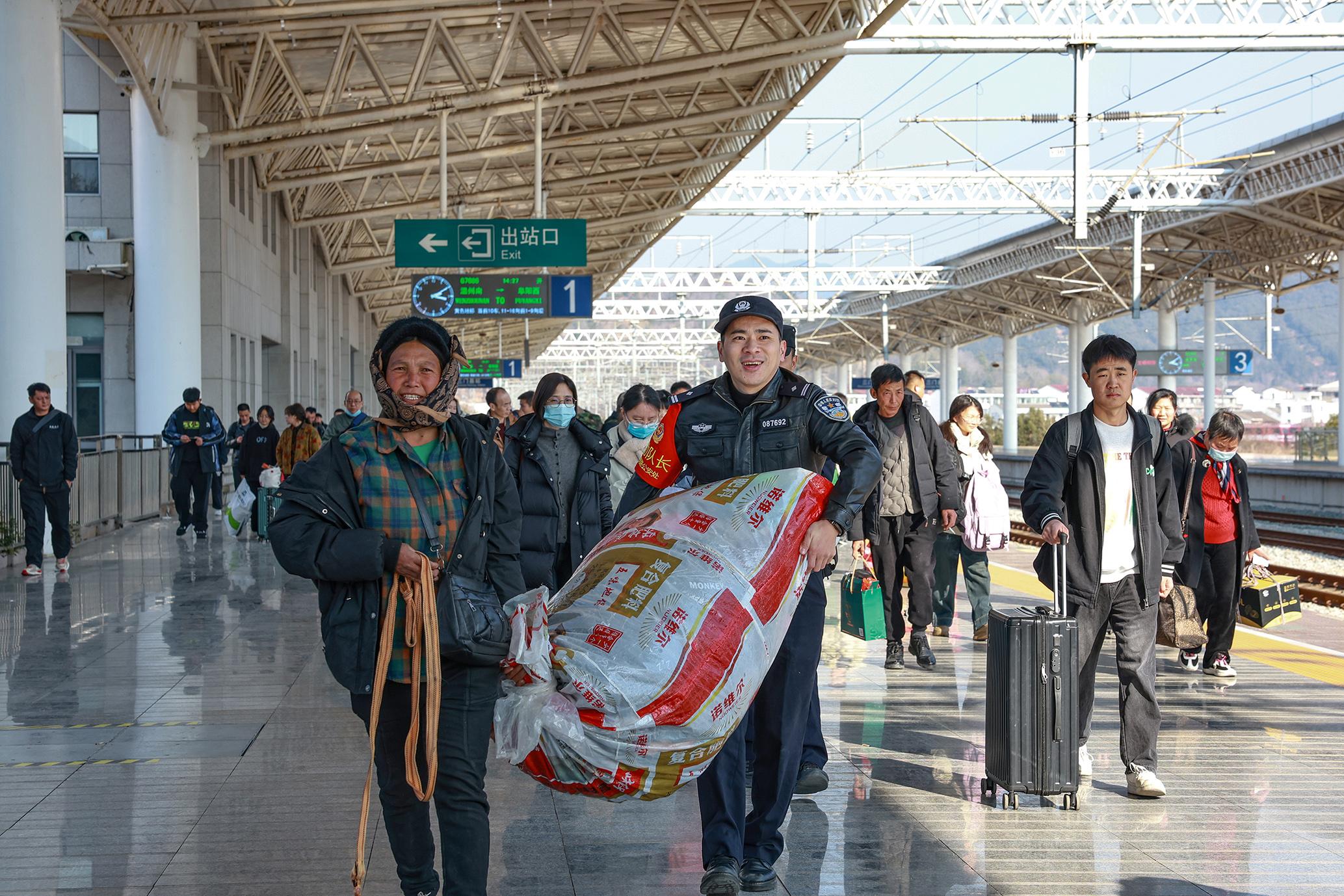 圖為1月18日,臺(tái)州火車站派出所民警幫助旅客搬運(yùn)行李。