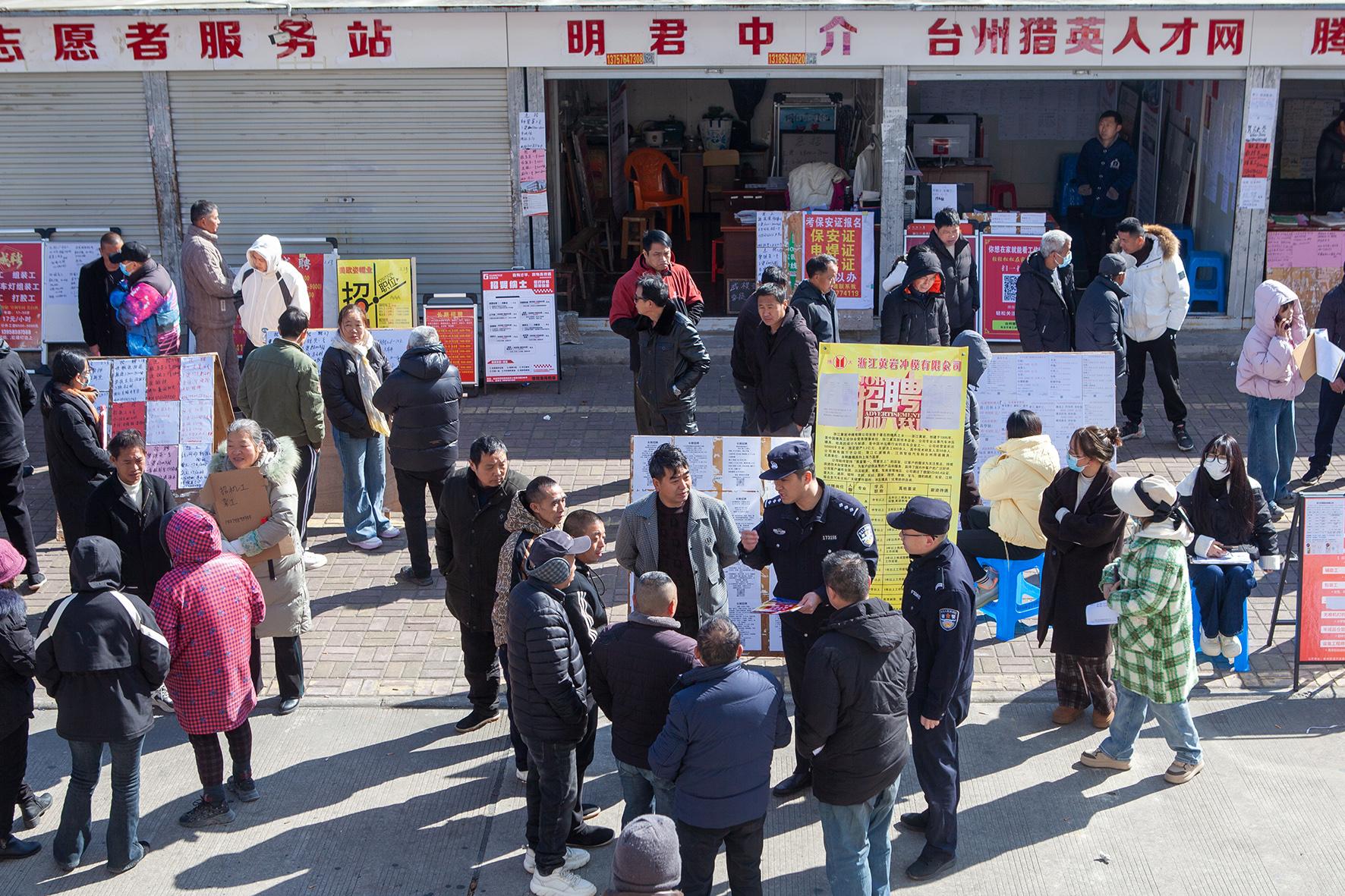 2月8日上午,浙江省臺州市黃巖區(qū)在人力資源市場舉辦首場新春招聘會。臺州市公安局黃巖分局城北派出所民警在現(xiàn)場開展以反詐、禁毒為主的安全防范宣傳,提高務(wù)工人員的安全防范意識。