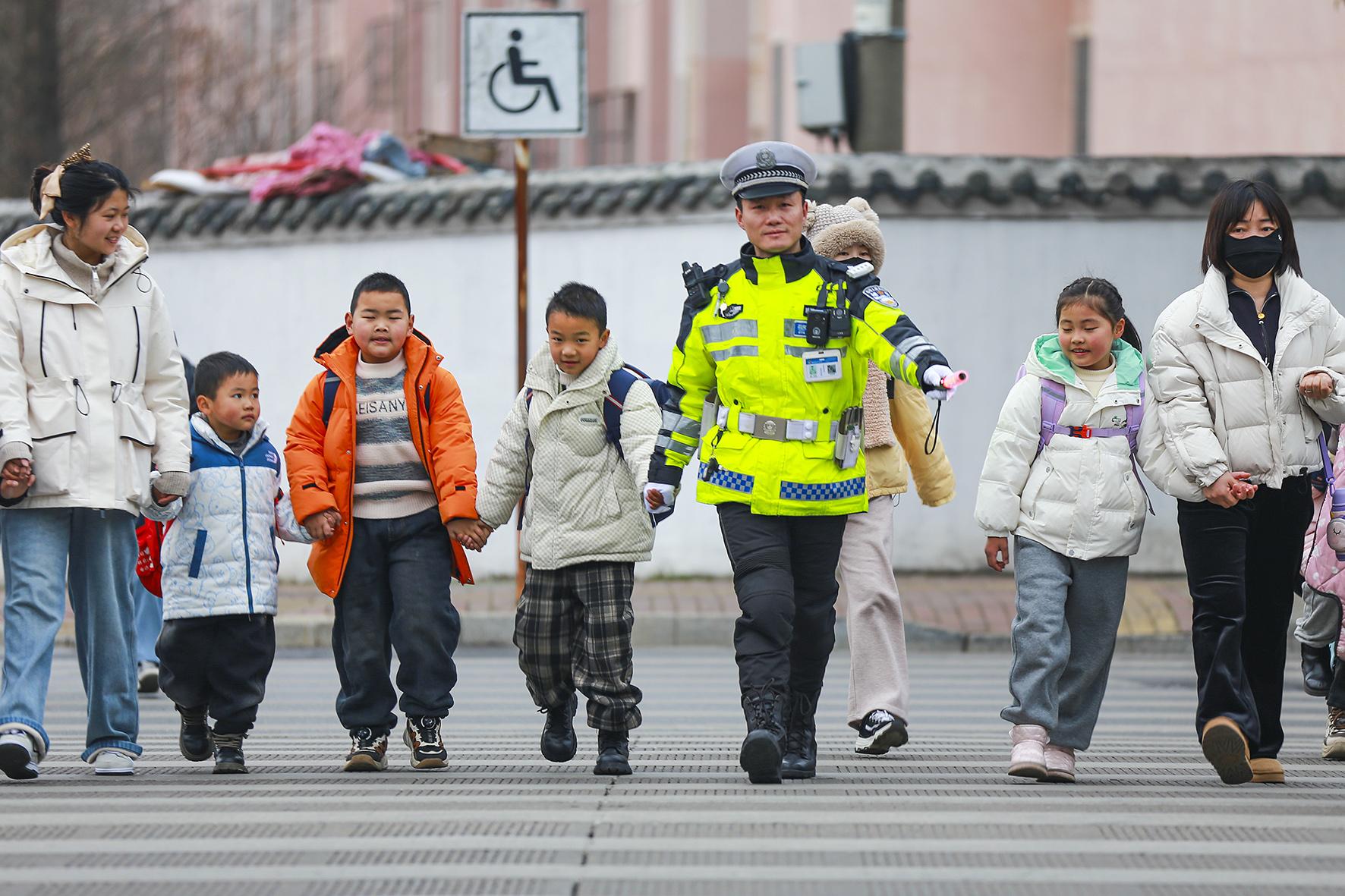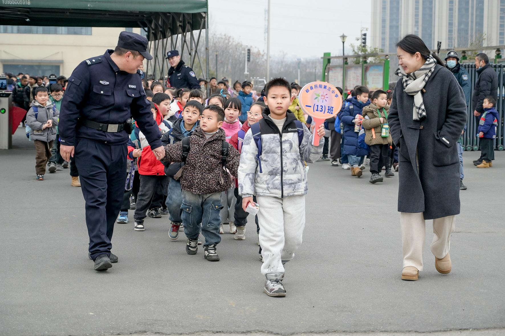 2月14日,安徽省馬鞍山市和縣公安局“護(hù)學(xué)崗”民警正在實(shí)驗(yàn)小學(xué)護(hù)送學(xué)生放學(xué)。