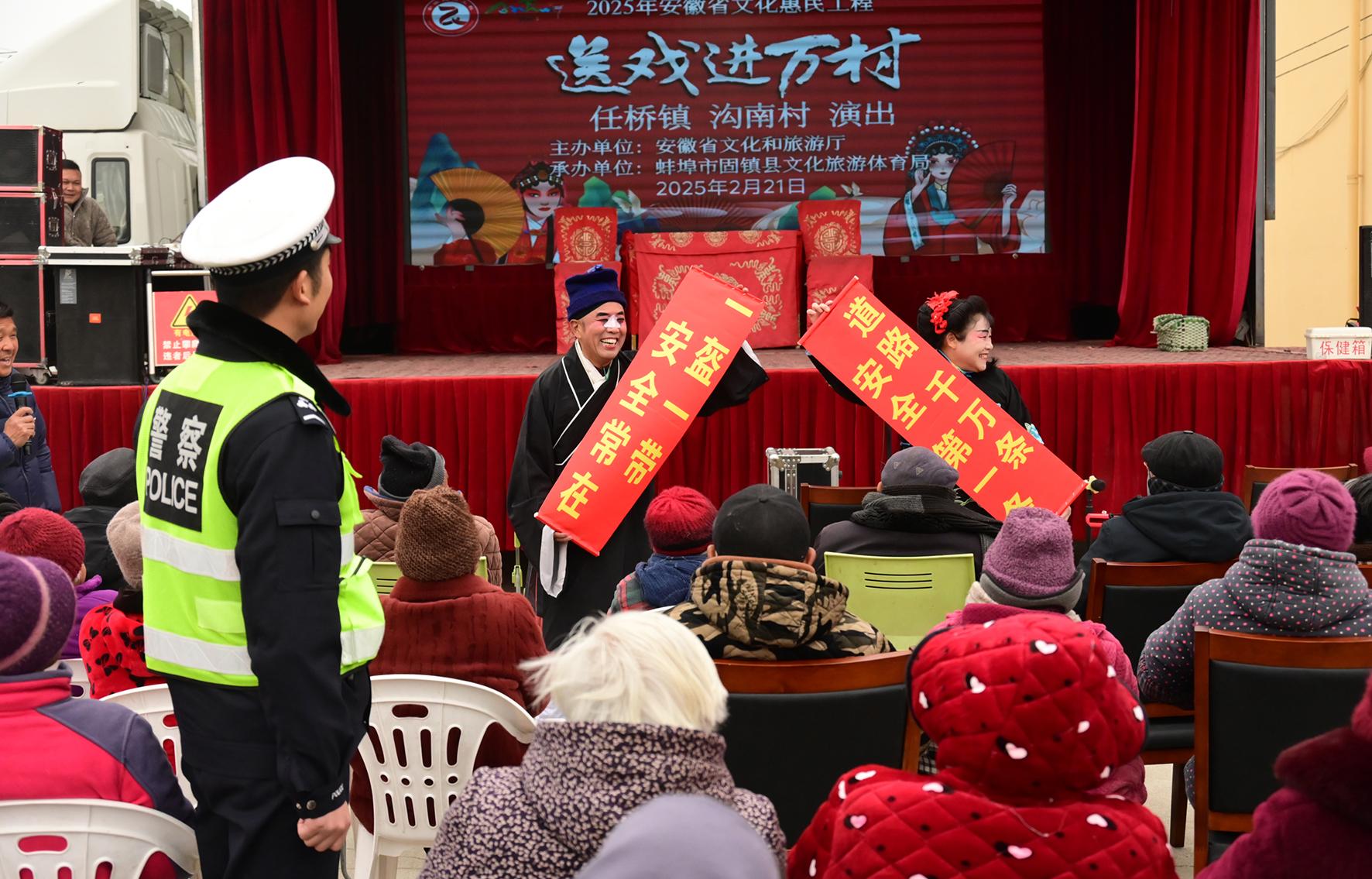 2月21日,安徽省蚌埠市固鎮(zhèn)縣公安局交管大隊組織警力隨“送戲進(jìn)萬村”活動走進(jìn)任橋鎮(zhèn)溝南村,開展“美麗鄉(xiāng)村行”交通安全主題宣傳活動。