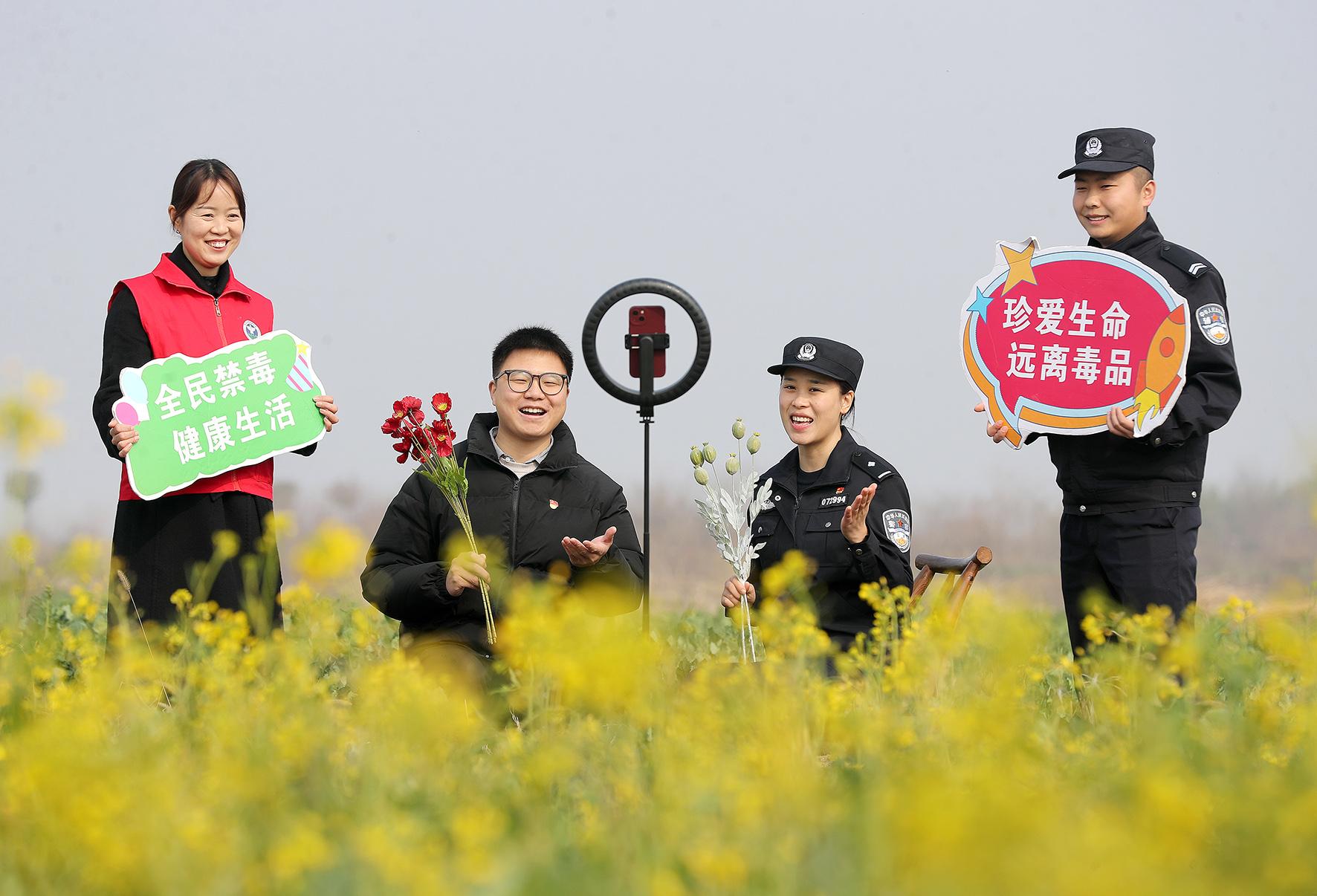 2月26日,在湖北省京山市羅店鎮(zhèn)馬嶺村,京山市公安局民警和禁毒志愿者在田間地頭,通過(guò)網(wǎng)絡(luò)現(xiàn)場(chǎng)直播的方式向群眾開(kāi)展防范和打擊非法種植毒品原植物的普法宣傳。