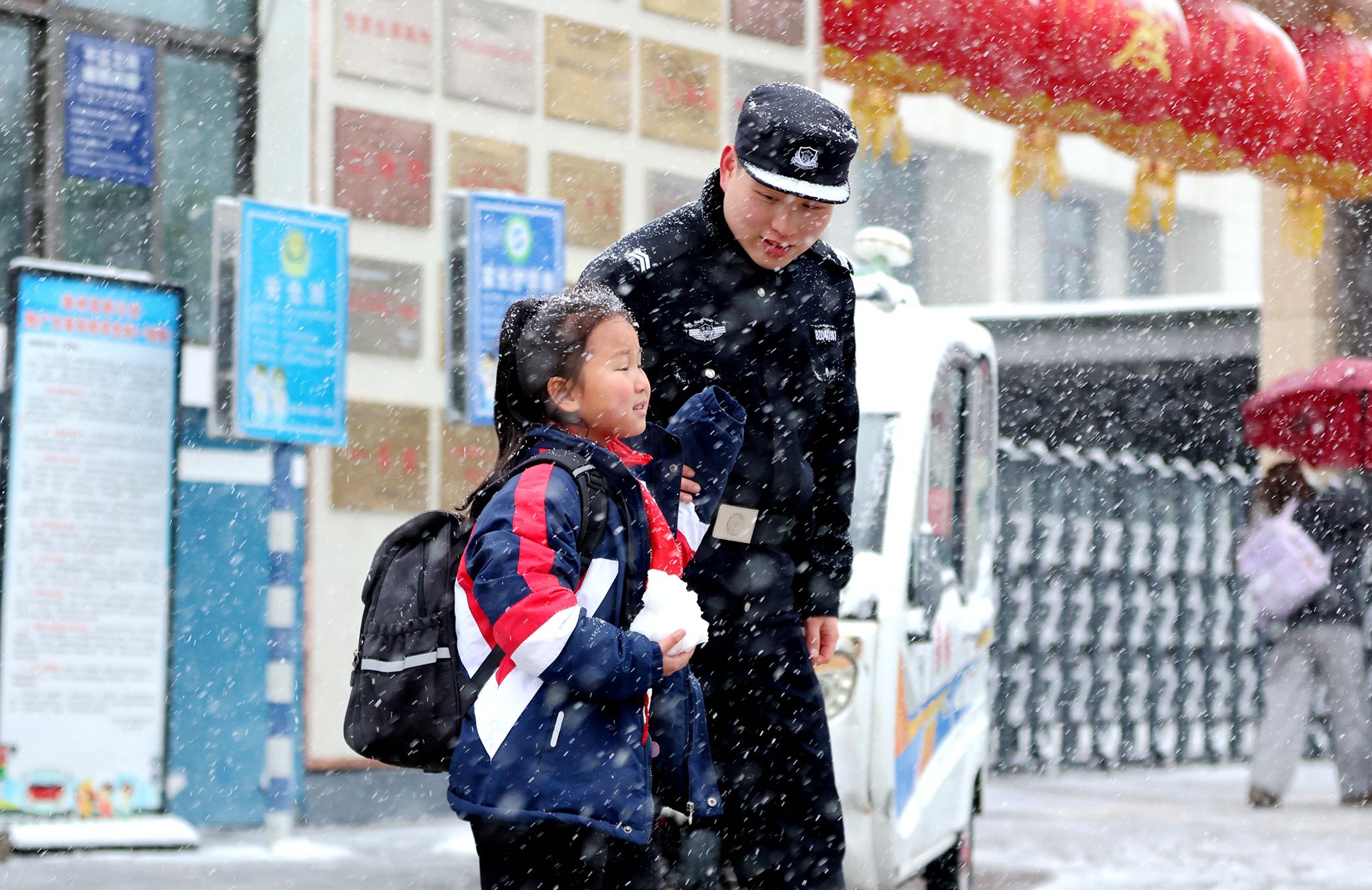 3月3日,安徽省亳州市公安局高新區(qū)分局民警輔警在雪中開展護(hù)學(xué)崗、交通疏導(dǎo)、暖心救助等工作。