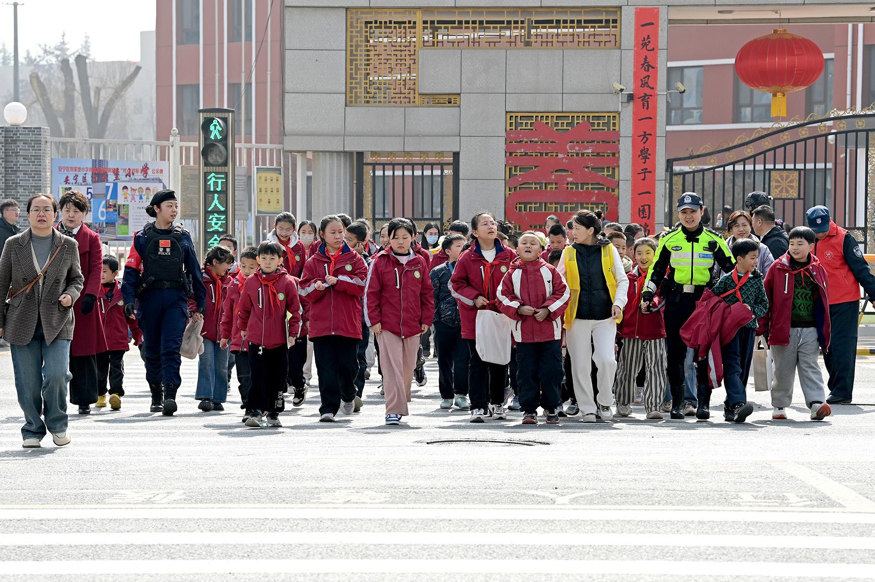 圖為3月4日,聯(lián)勤護(hù)學(xué)警力放學(xué)時(shí)段開展護(hù)學(xué)工作。