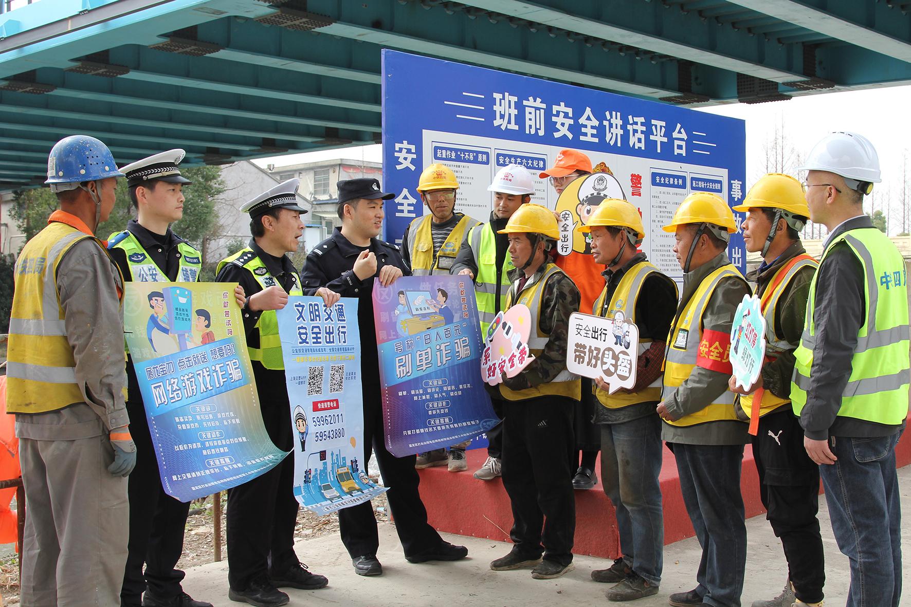 3月11日,上海市公安局嘉定分局交警支隊(duì)、徐行派出所民輔警會同平安志愿者走進(jìn)滬渝蓉鐵路滬寧段二標(biāo)二分部建設(shè)工地,向務(wù)工人員開展交通安全、人口信息自主申報(bào)、反詐騙等知識宣講。