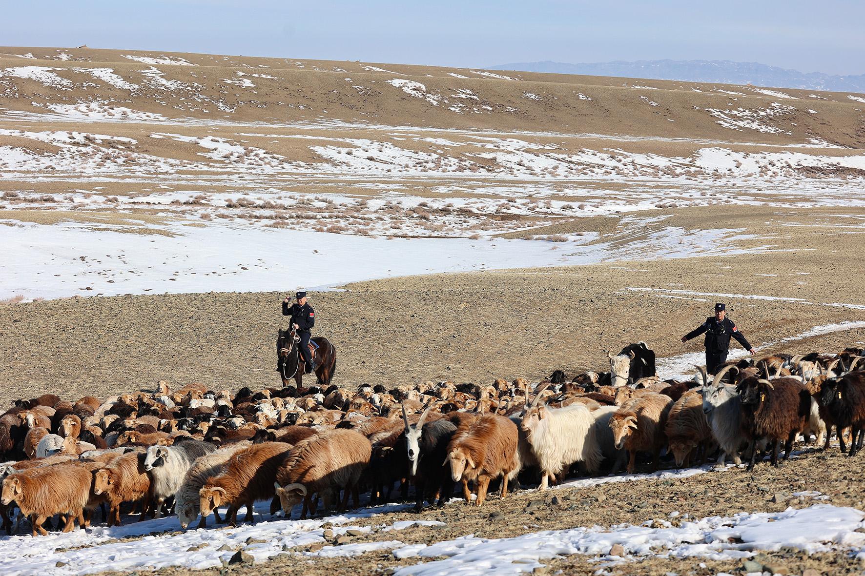 圖為3月18日,民警幫助牧民進(jìn)行轉(zhuǎn)場(chǎng)。