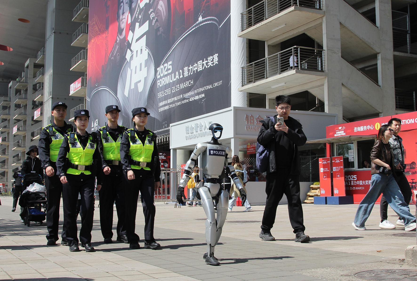 圖為民警與智能機(jī)器人在上海國際賽車場(chǎng)開展融合巡防。