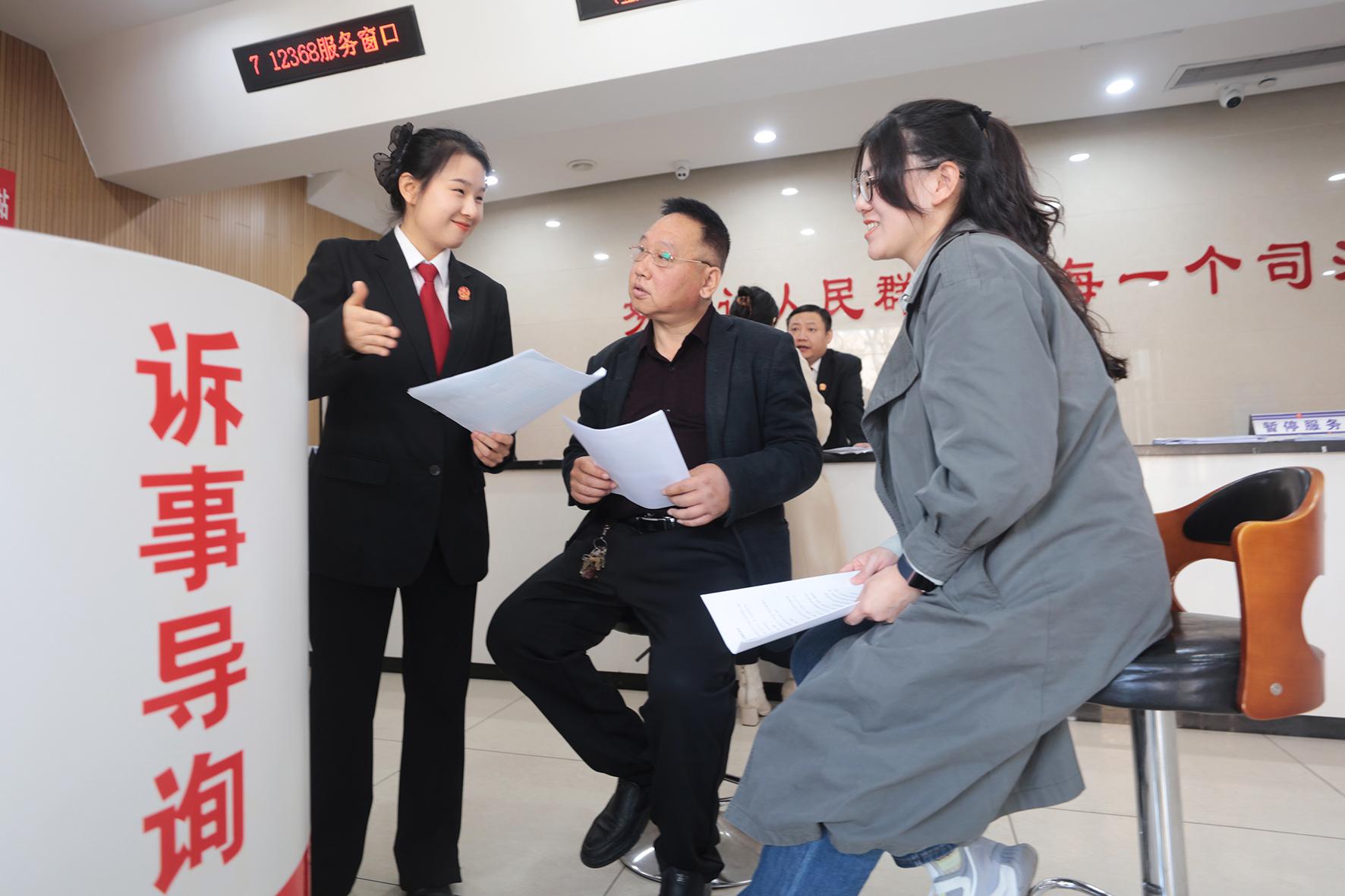 圖為4月3日,訴事導(dǎo)詢組工作人員為前來辦事的群眾提供導(dǎo)訴服務(wù),并為其答疑解惑。