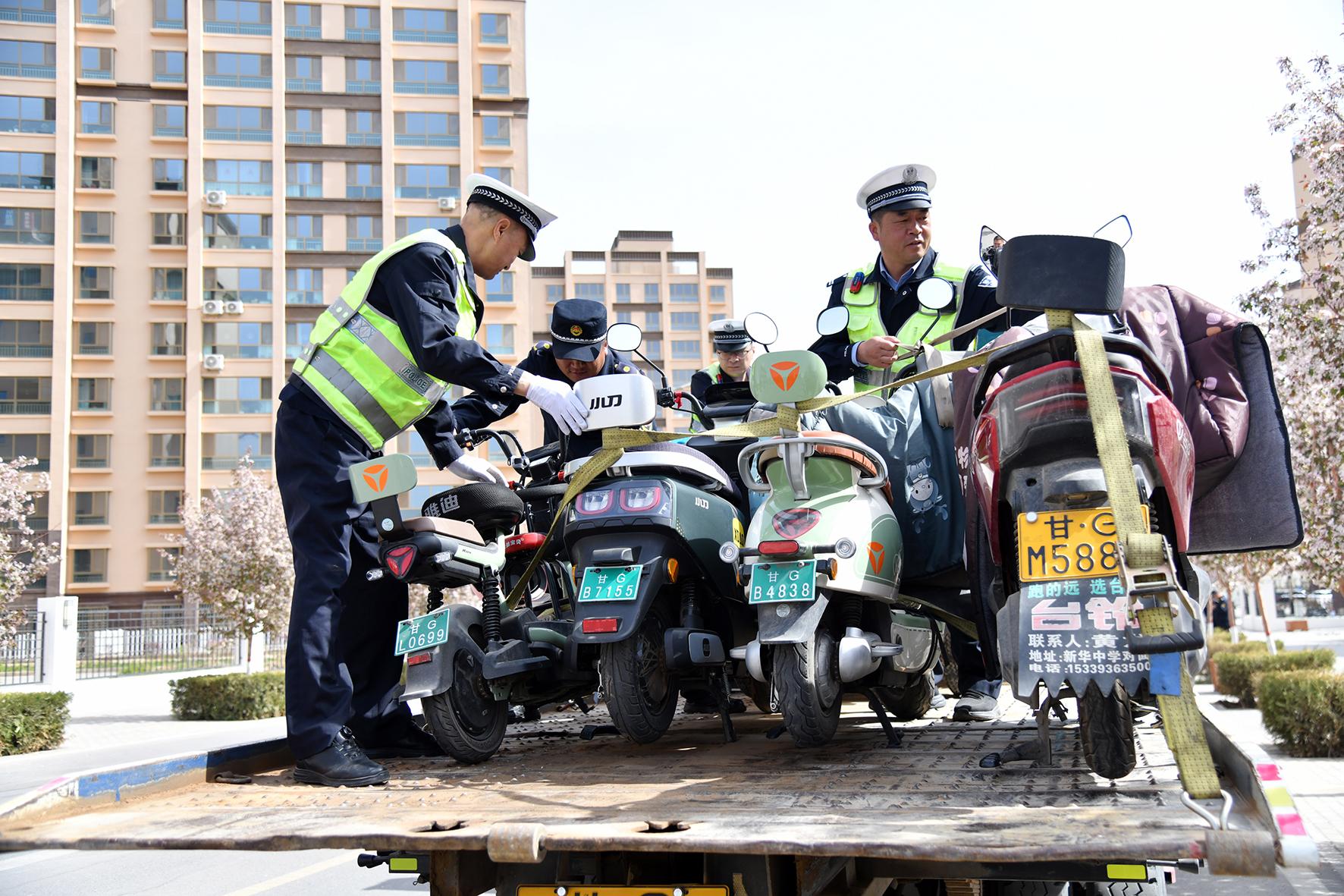 4月23日,甘肅省臨澤縣公安局交警大隊城區(qū)中隊聯(lián)合城管執(zhí)法隊在城區(qū)開展“亂停亂放”專項整治行動,集中查處不按規(guī)定停放電動車行為。