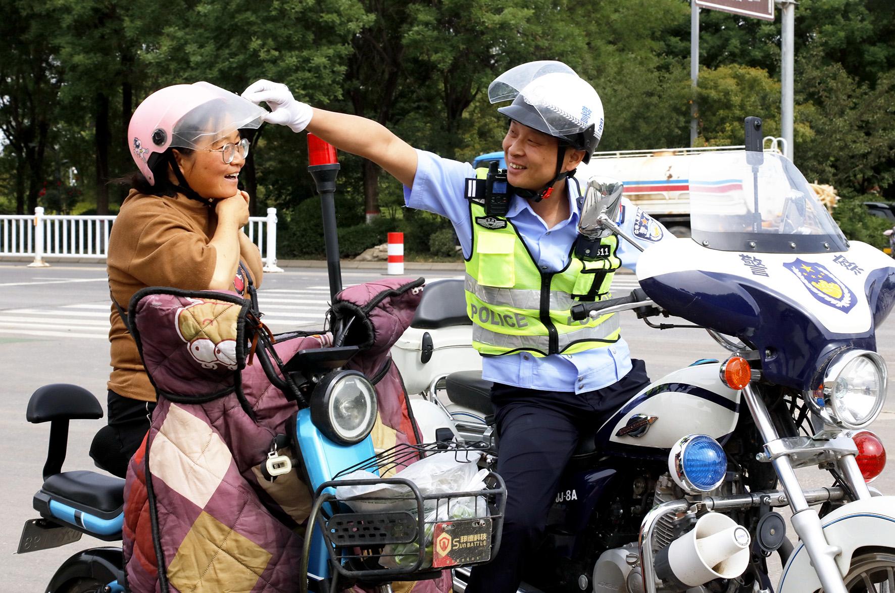 5月5日,陜西省渭南市公安局交警支隊臨渭大隊四中隊民警提醒一輛電動車駕駛?cè)舜骱妙^盔。