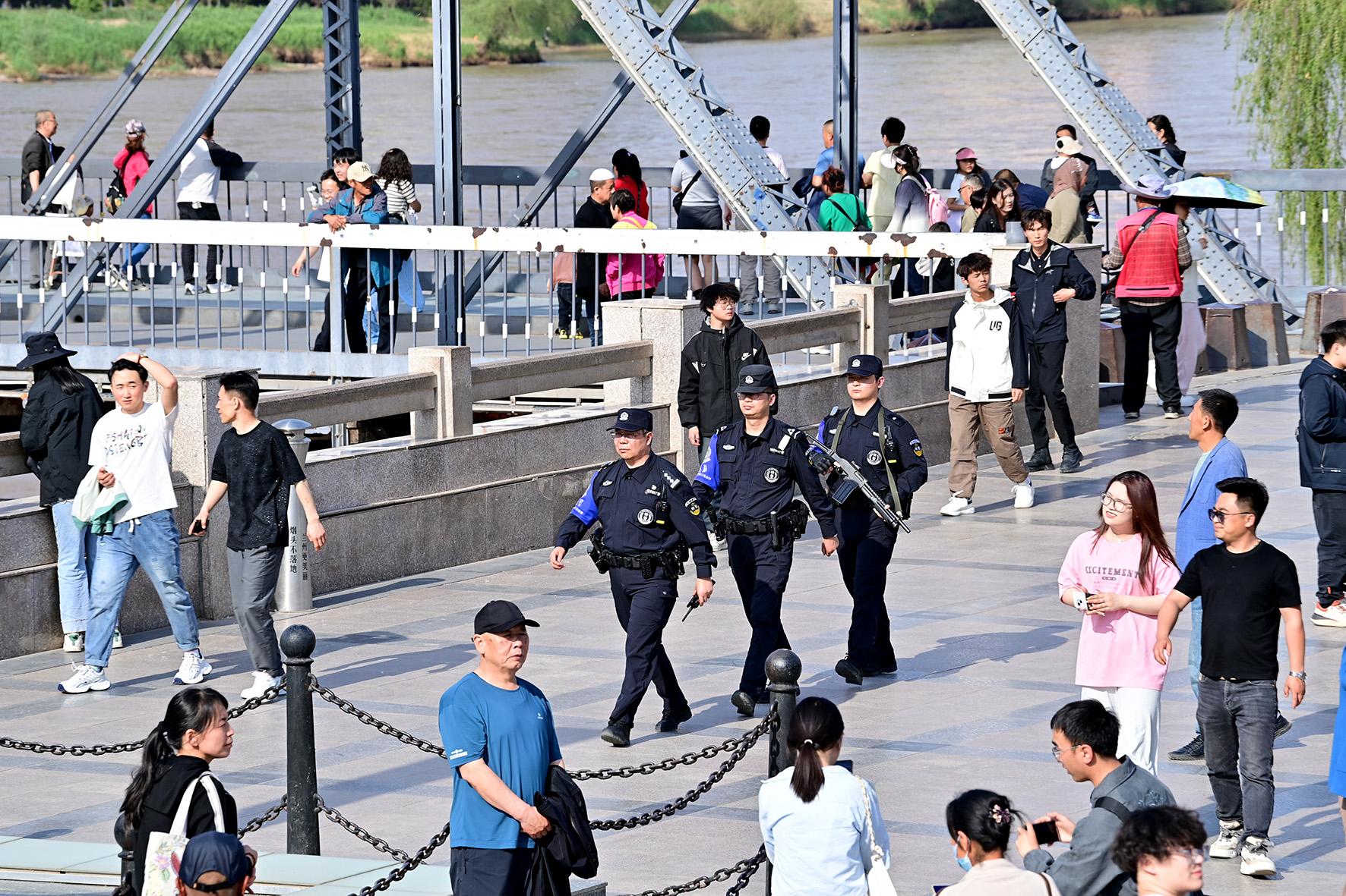 5月1日,甘肅省蘭州市公安局城關(guān)分局中山橋警務(wù)站警力在中山橋景點開展巡邏。